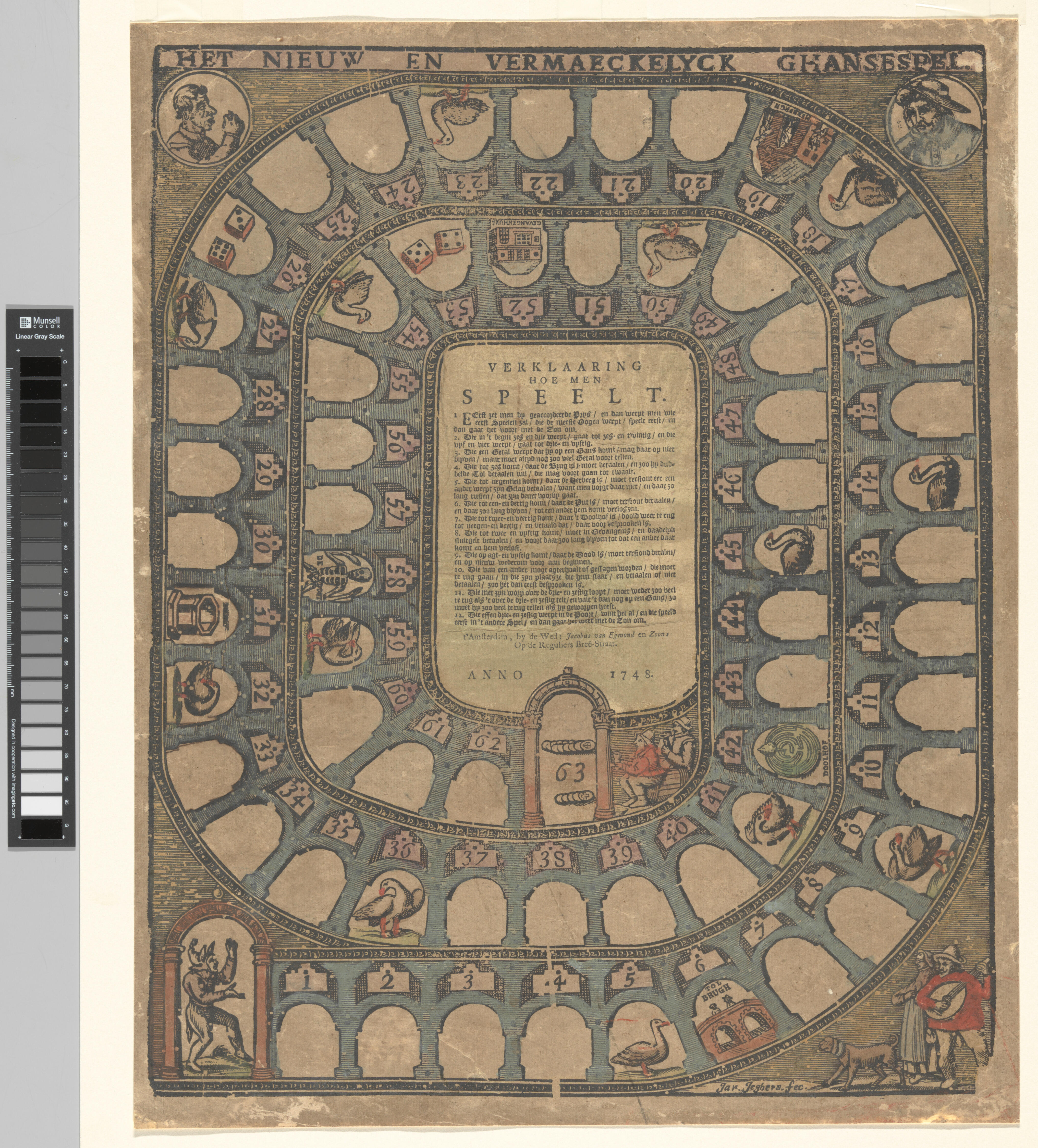Dit ganzenbordspel is een met de hand ingekleurde houtsnede en werd uitgegeven in 1748 door Weduwe Jacobus van Egmont & Zoon in Amsterdam. De houtsnede is door de Antwerpse houtgraveur Jan Christoffel Jegher gemaakt. In het middenveld staan de spelregels in boekdruk. Het Nederlands Openluchtmuseum bezit een aantal identieke ganzenborden, onder andere uit 1777 en ...
