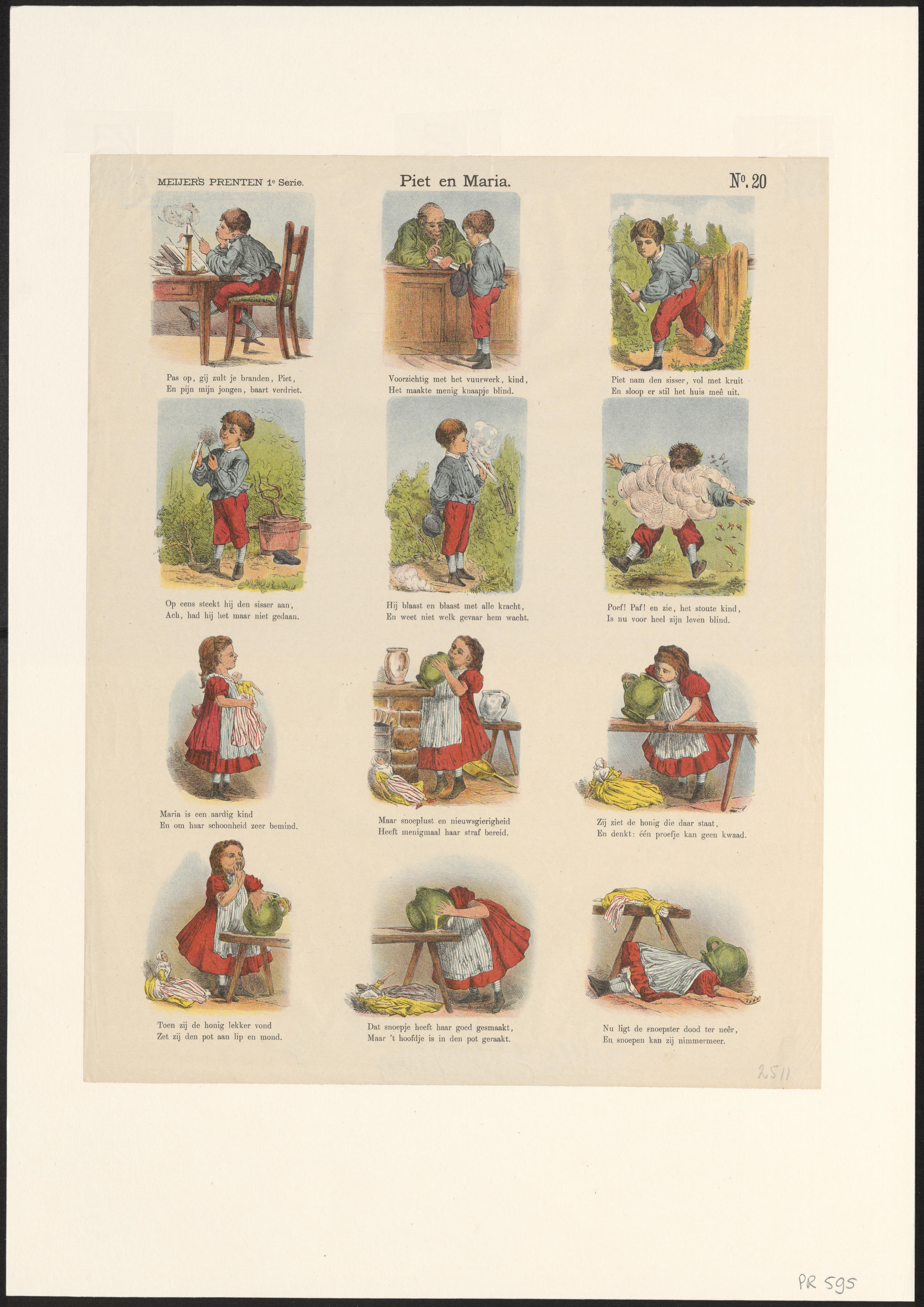 Prent met twaalf afbeeldingen, gedrukt in lithografie. In de bovenste zes afbeeldingen wordt het verhaal van Piet verteld, die blind wordt door spelen met vuurwerk. In de onderste zes afbeeldingen staat het verhaal van Maria, die overlijdt aan de gevolgen van haar snoeplust. Onder iedere afbeelding staat een onderschrift. Op de prent staat geen uitgeversadres. ...