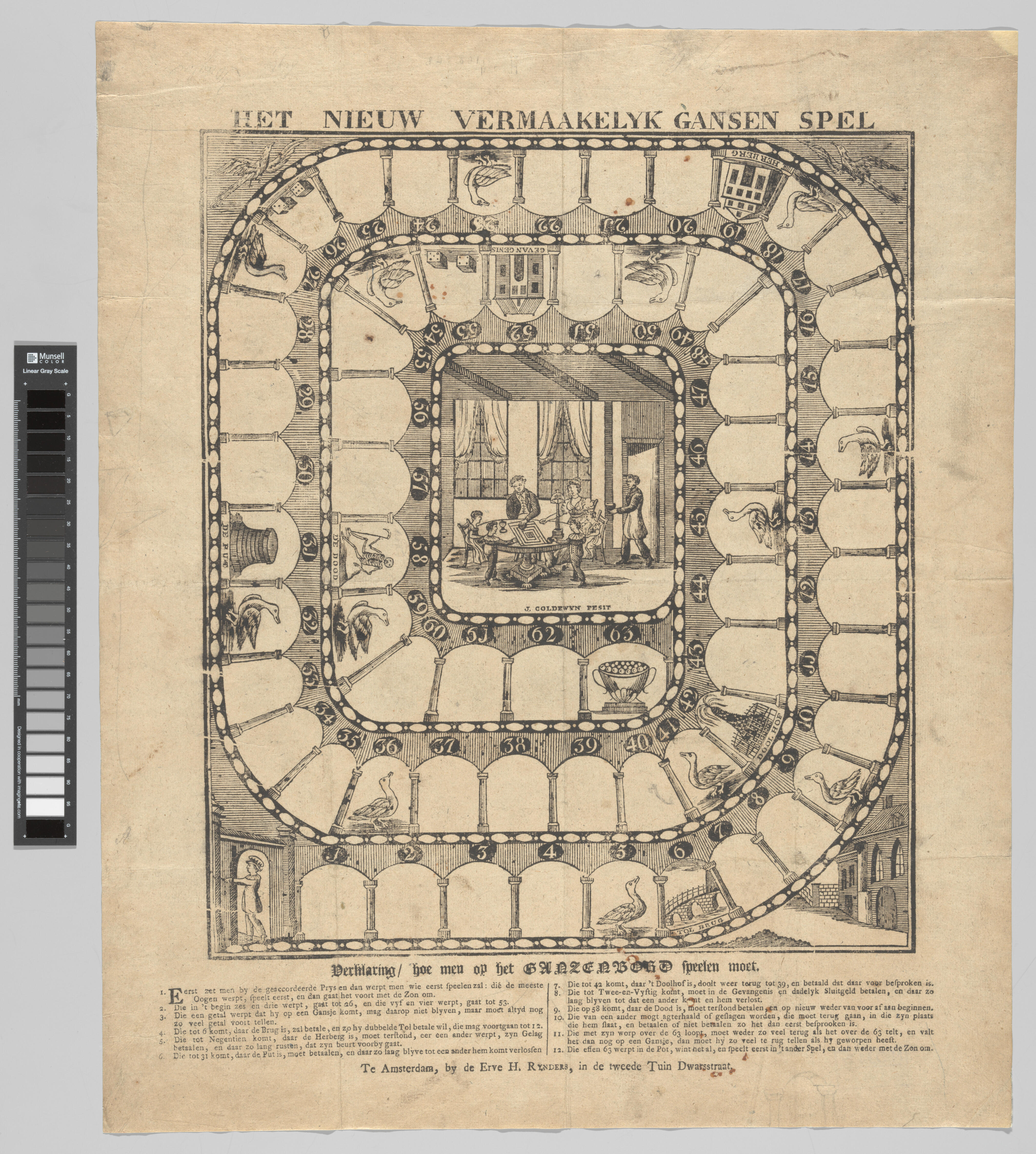 Het ganzenbordspel is tussen 1781 en 1831 uitgegeven door de Erve H. Rynders in Amsterdam. Op het middenveld is een gezin afgebeeld dat het ganzenbordspel speelt. Dit kan er op wijzen dat het inmiddels niet meer alleen als gokspel, maar ook als een gezelschapsspel voor huiselijke kring in gebruik was. Het is gedrukt in houtsnede. ...