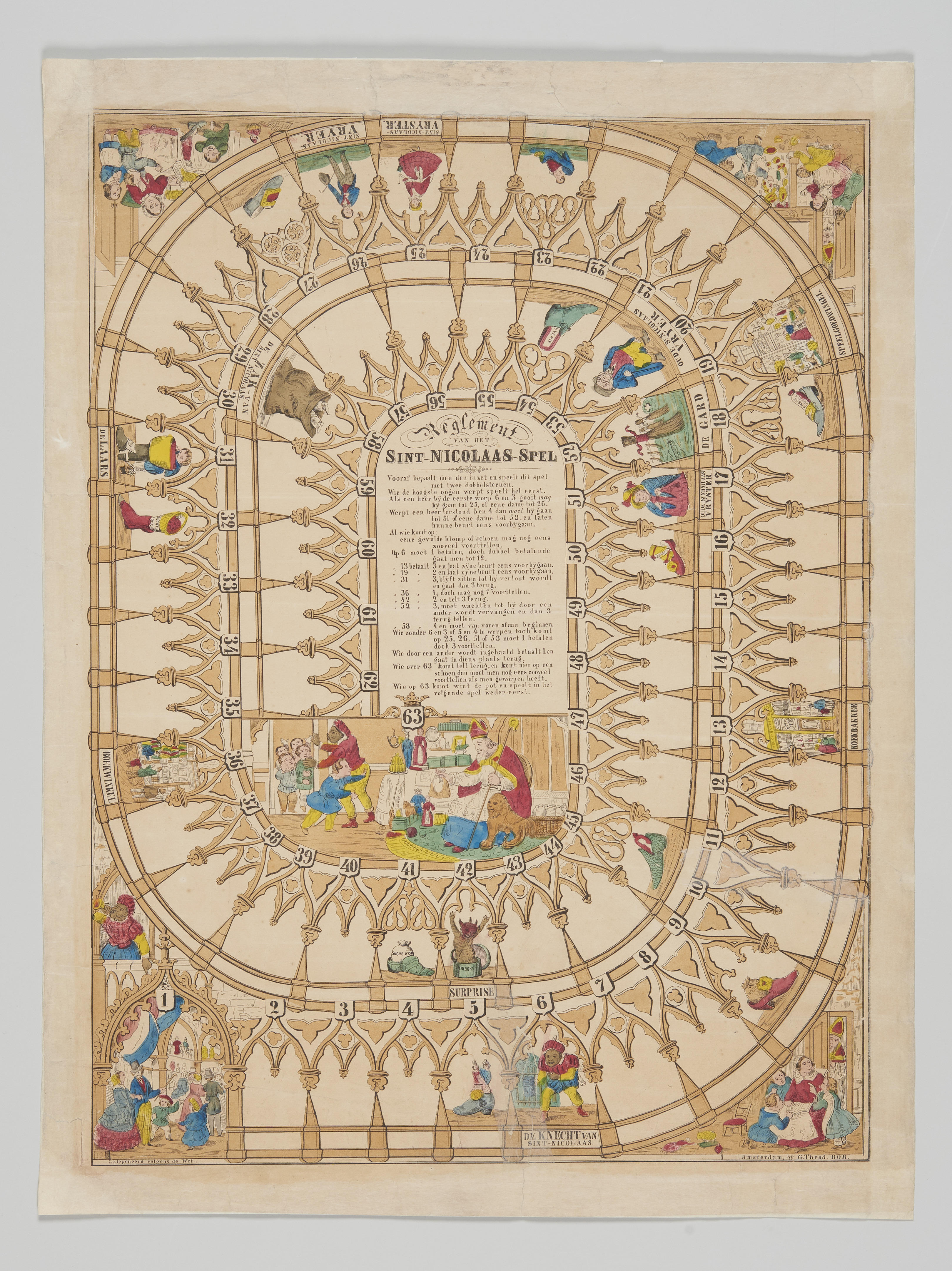 Spiraalvormig potspel met 63 speelvakken. Bij vakje 63 is de Sint zittend aan een cadeautafel afgebeeld, terwijl zijn knecht de deur opent voor de kinderen. In de vier hoeken van het speelbord zijn sinterklaastaferelen te zien. In het midden staan de spelregels.