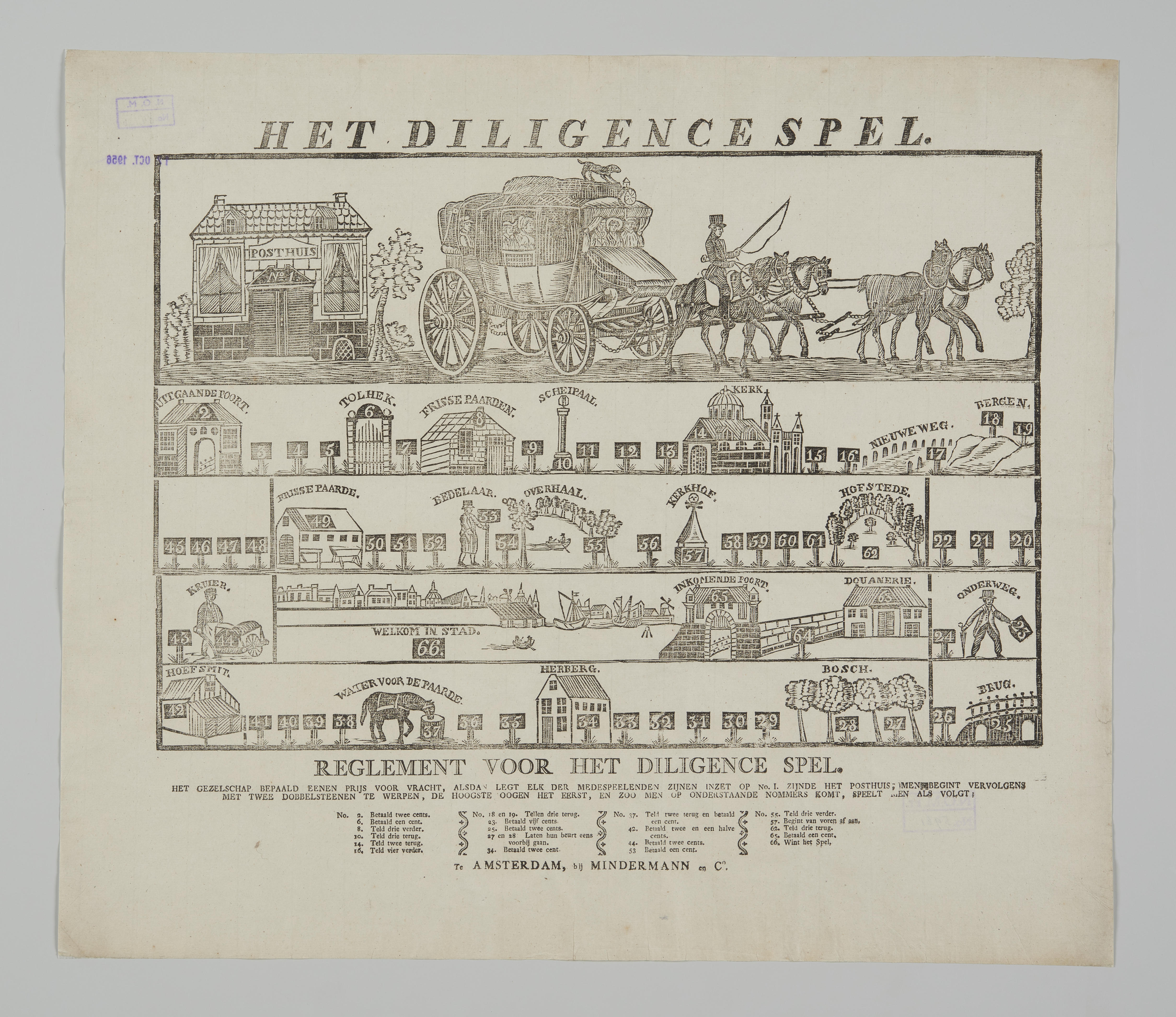 Bordspel, bestaande uit vijf horizontale stroken en een reglement. De bovenste strook toont een posthuis en een diligence, getrokken door vier paarden. De stroken daaronder, met de nummers 2-42, tonen afbeeldingen van de plekken waar de postkoets langskomt.