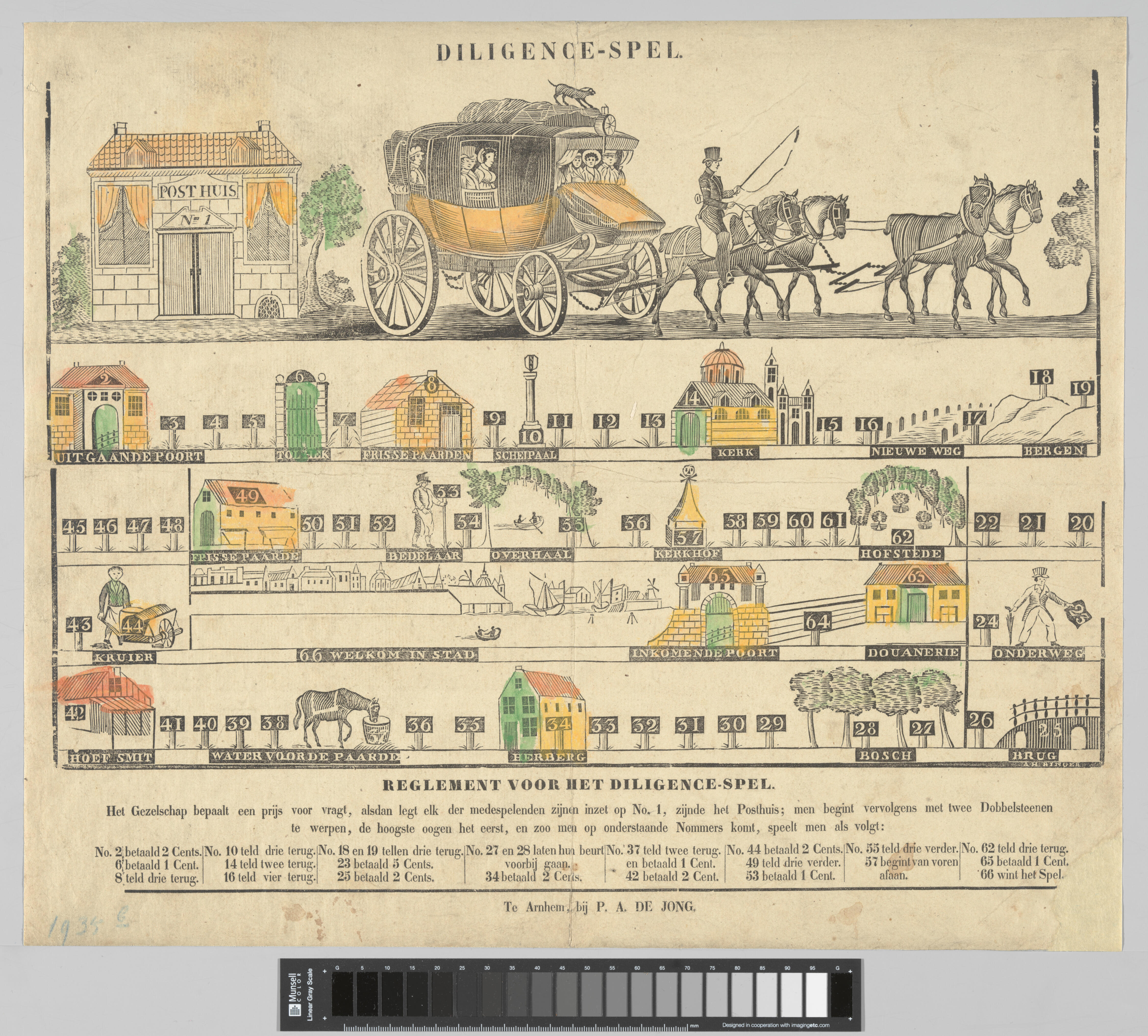 Bordspel, bestaande uit vijf horizontale stroken en een reglement. De bovenste strook toont een posthuis en een diligence, getrokken door vier paarden. De stroken daaronder, met de nummers 2-42, tonen afbeeldingen van de plekken waar de postkoets langskomt.