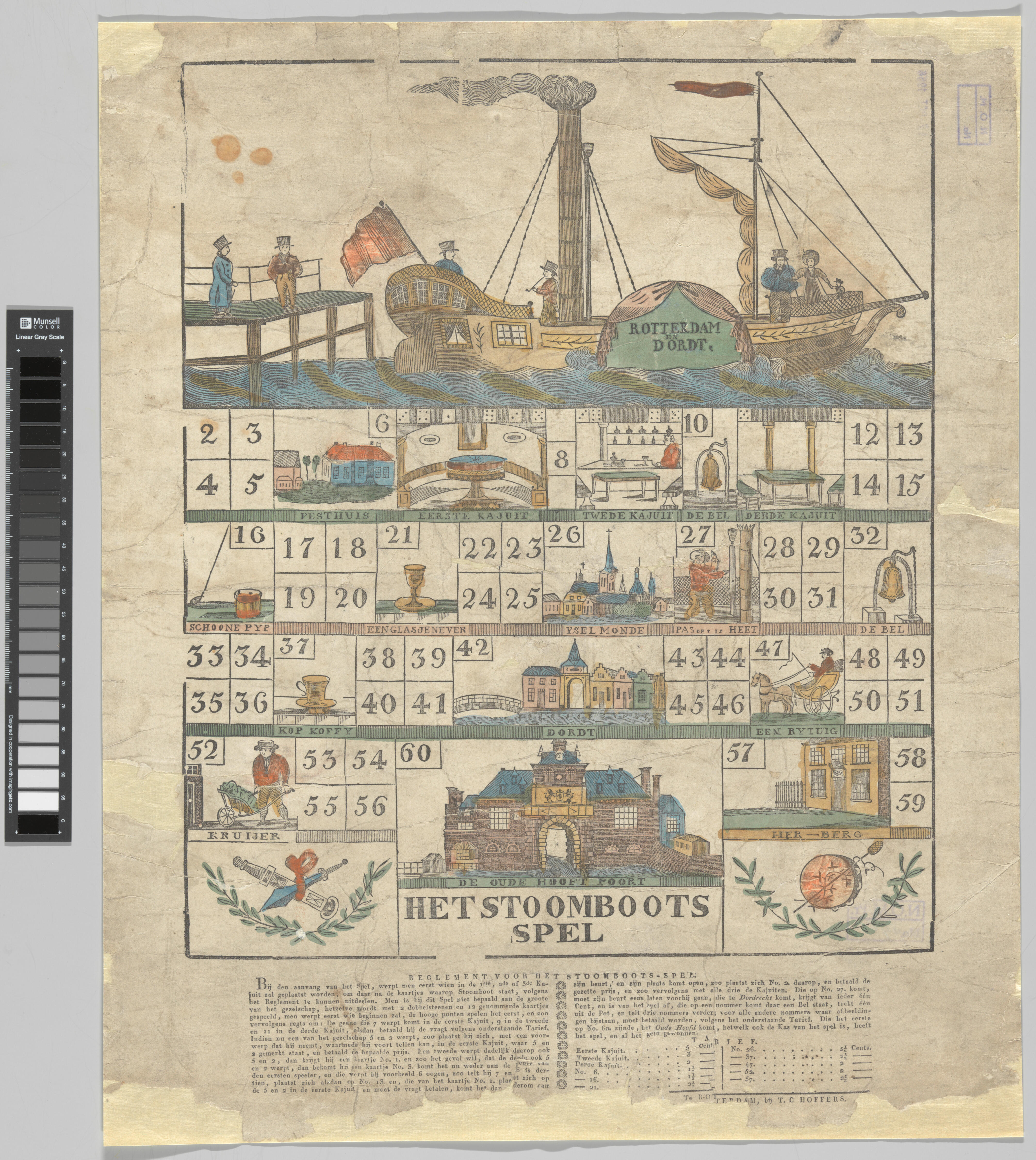 Bordspel met zestig speelvakken en een reglement onderaan het speelbord. In het eerste vak staat een afbeelding van een boot die vaart tussen Rotterdam en Dordrecht. Op het voordek staan een man, vrouw en kind; op de steiger twee andere figuren. In vakje 60 is een voorstelling van de Oude Hoofdpoort te zien.