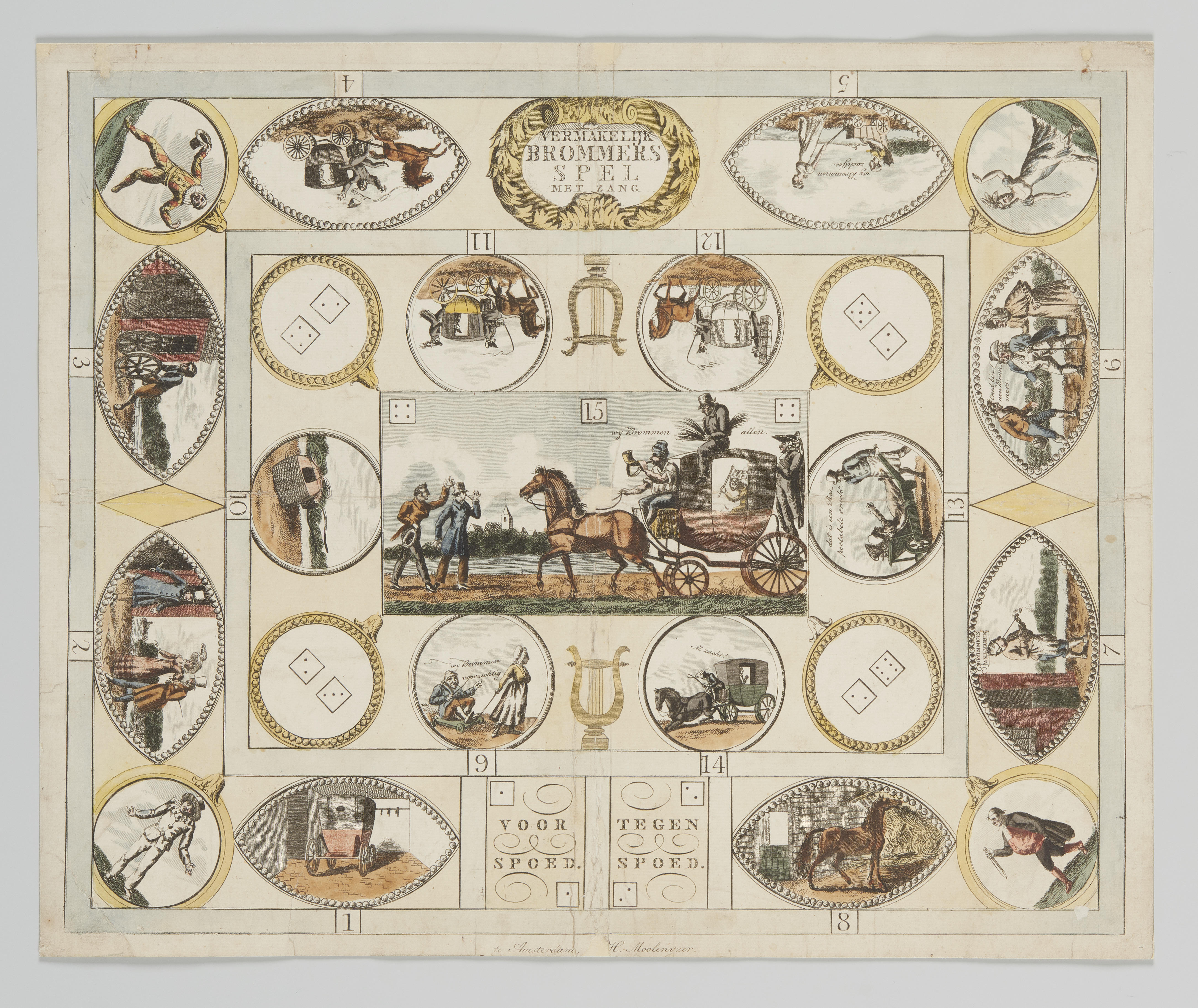 Speelbord van een ganzenbordachtig dobbelspel met vijftien speelvakken. In het midden is een koets (brommer) afgebeeld met daarin een aap en op het dak een schoorsteenveger. In de vier hoeken zijn vier figuren uit de Commedia dell'arte te zien: Pierrot, Harlekijn, Colombine en Pantalone. 'Brommer' noemde men de eerste huurrijtuigen die in Amsterdam rond 1819 ...