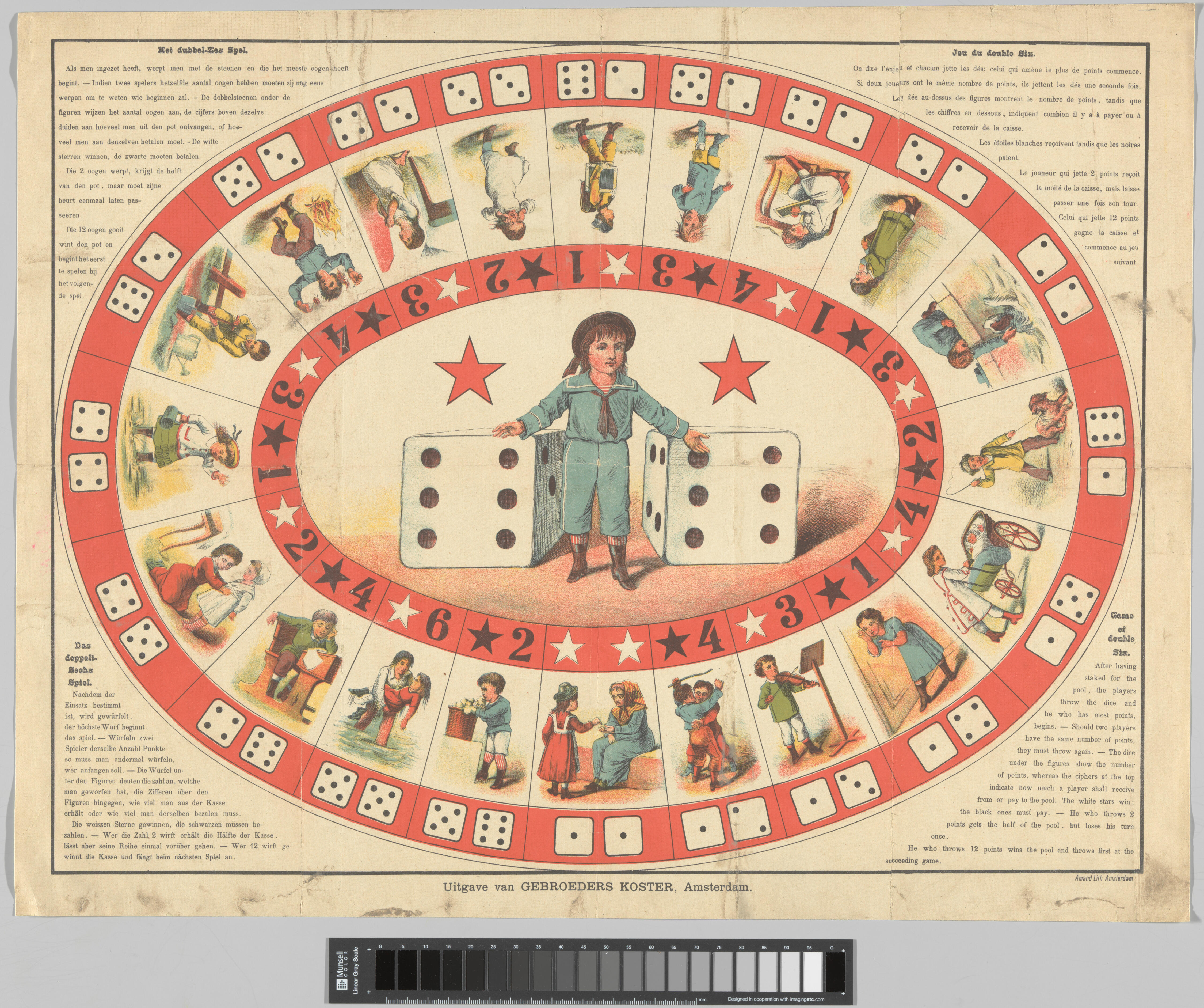 Bordspel met de spelregels in vier talen in boekdruk in de vier hoeken van het blad. Op het speelplan in het midden is een jongen afgebeeld met twee grote dobbelstenen waarop zes ogen staan. Daaromheen zit een tweede ovaal met figuren, twee dobbelstenen met verschillende ogen en een zwarte of witte ster bij een getal. ...