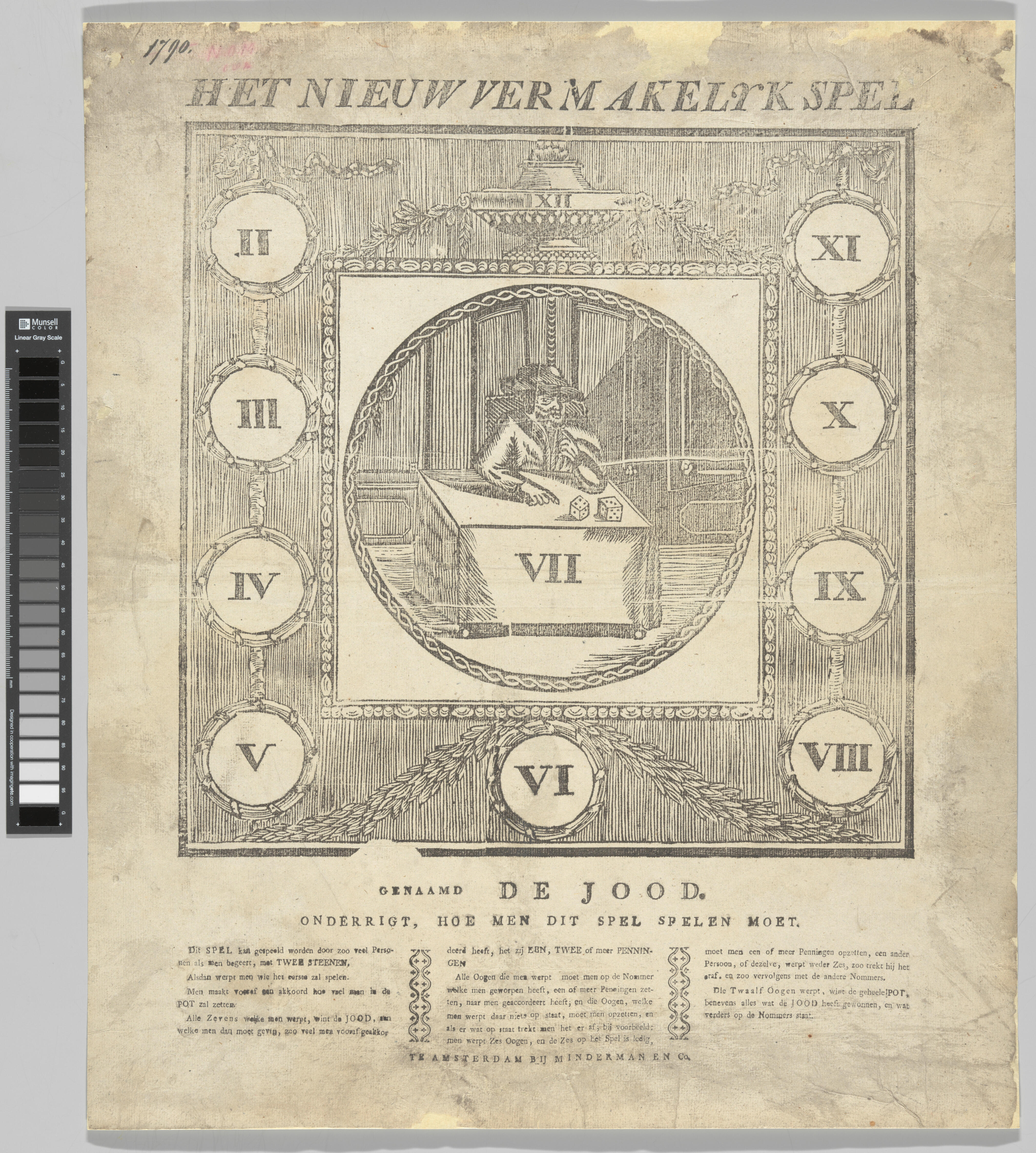 Spel met in het midden een cirkel waarin een Joodse man met een hoed op aan tafel zit. Op de tafel liggen twee dobbelstenen. Daaromheen in rondjes staan de Romeinse cijfers 2-12. Op de tafel van de man staat het cijfer 7. Dit spel is een werpspel naar een laat-achttiende-eeuws Frans voorbeeld. Het weerspiegelt het ...