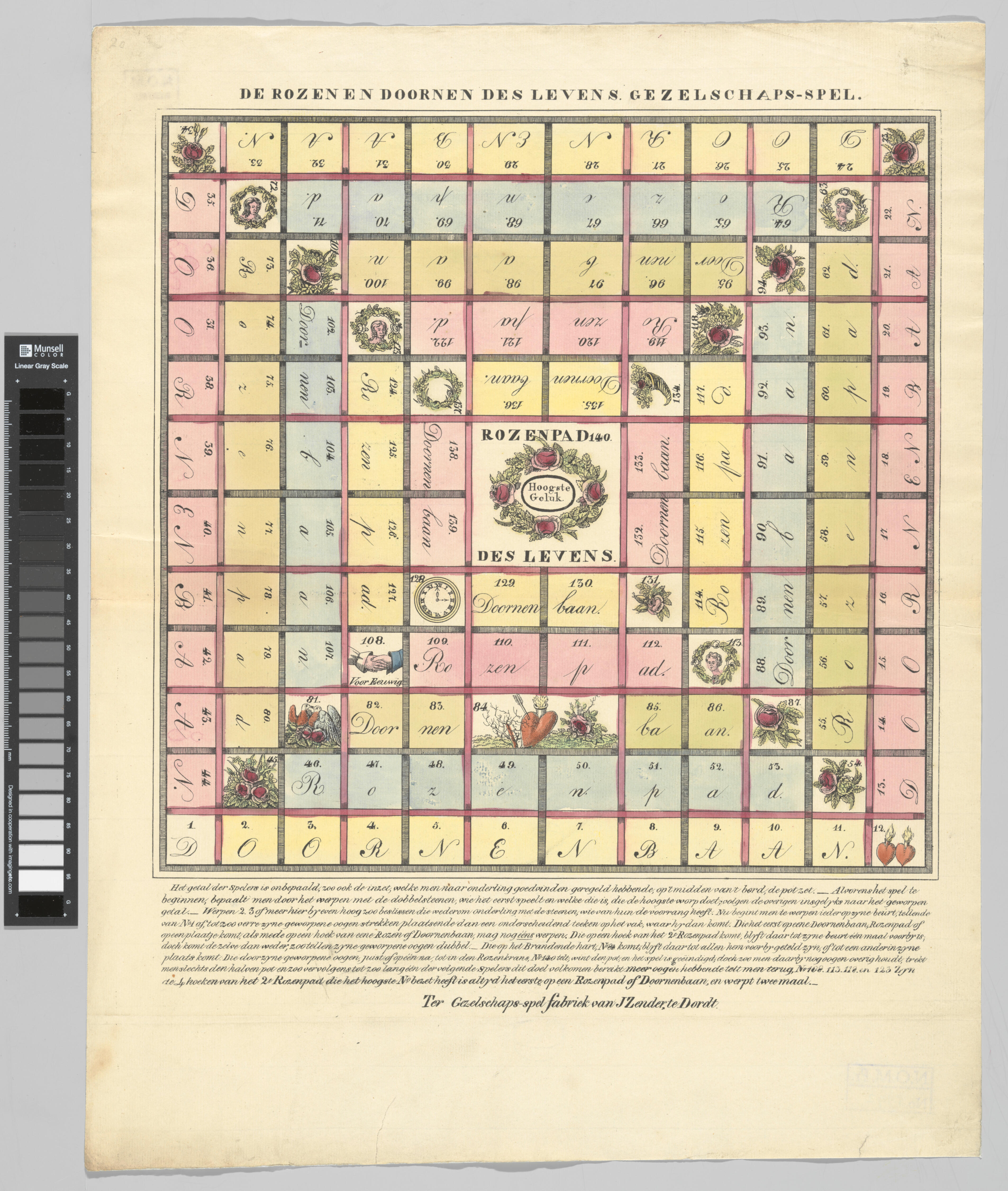 Geluksspel met een vierkant speelveld, bestaande uit 140 vakjes. Twee diagonale lijnen met bloemmotieven kruisen elkaar over het hele veld. In het midden, in vakje 140, is een vierkant met een krans van rozen om een schild te zien met de tekst: 'Rozenpad Des Levens. Hoogste Geluk.'