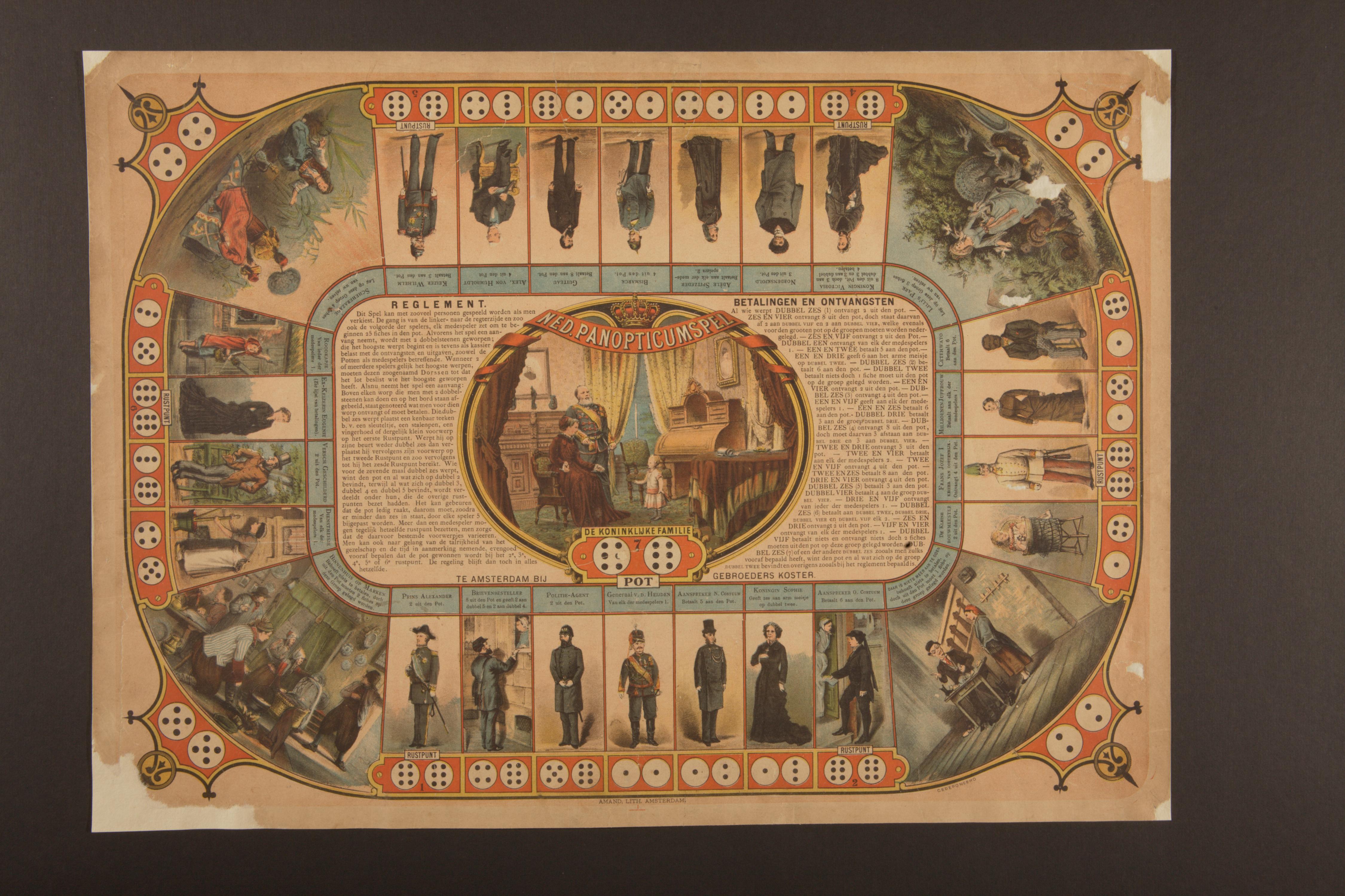 Bordspel van het Panopticum in Amsterdam, waar wassen beelden van ondere andere de koninklijke familie te zien waren. In het midden van het bord is een afbeelding van koning Willem III, koningin Emma en prinses Wilhelmina te zien, met daaromheen de spelregels.