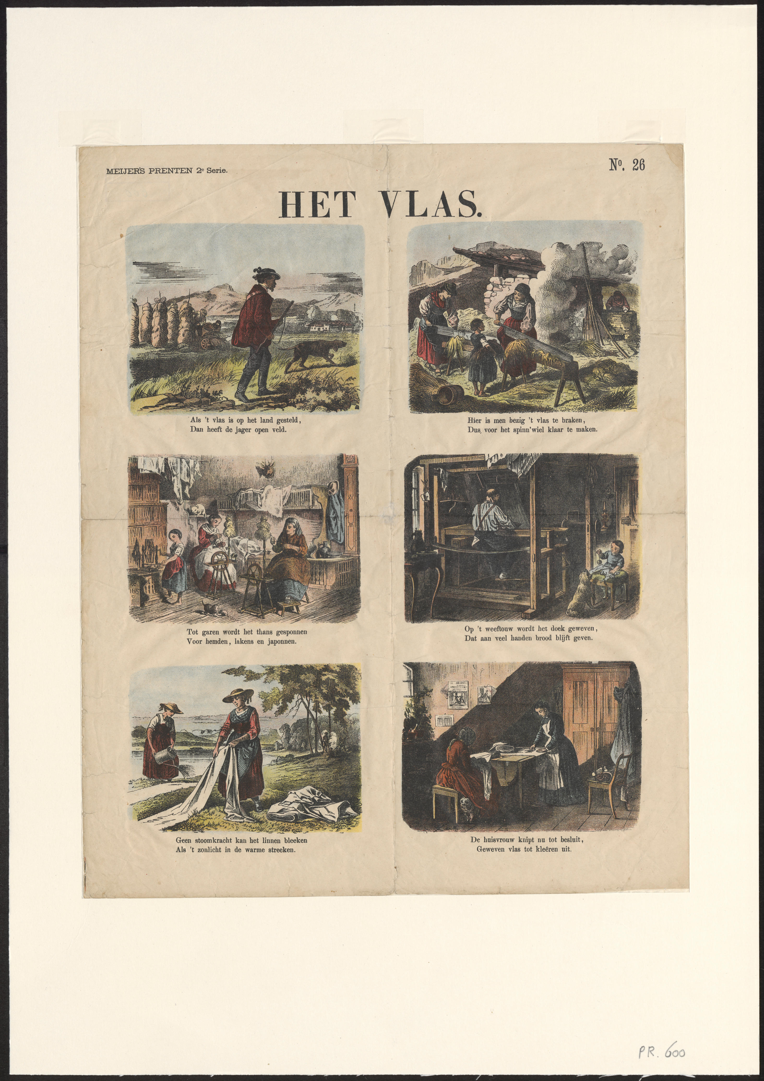 Op de zes afbeeldingen, gedrukt in lithografie, staan de verschillende stadia van het verwerken van vlas tot linnen afgebeeld. De prent is uitgegeven door De Ruyter & Meijer in Amsterdam. Deze prent komt uit de tweede serie, die werd uitgegeven vanaf december 1874. De serie Meijers Prenten werd waarschijnlijk voor een deel geproduceerd met tweedehands ...