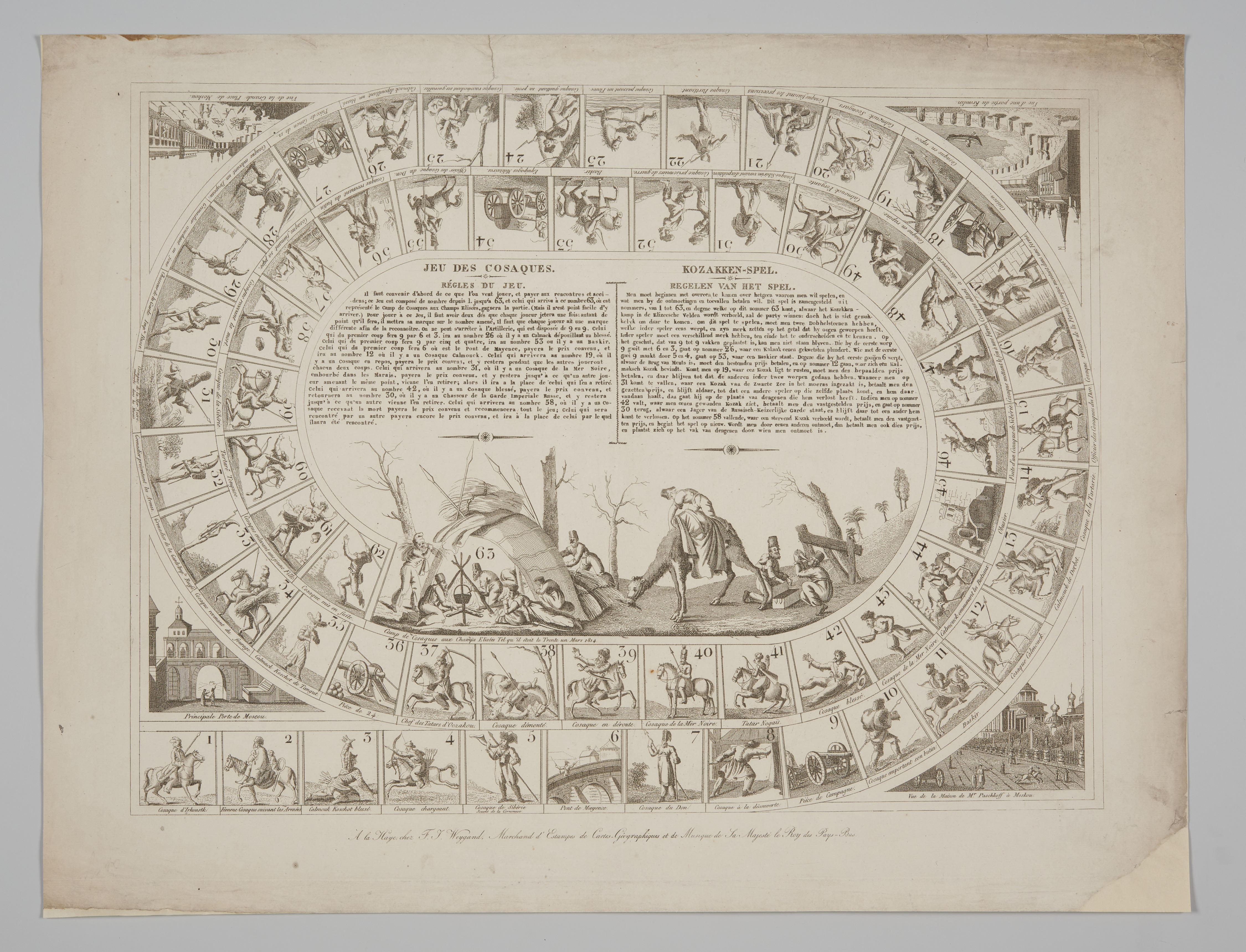 Ganzenbordachtig spel met 63 speelvakken en de spelregels in het midden van het speelbord in het Nederlands en het Frans. Het spel geeft uitdrukking aan de schrik en verbazing waarmee de Parijzenaars aankeken tegen de komst van de soldaten van het geallieerde leger (Kozakken) op Franse bodem. In de hoeken zijn plaatsen in Moskou te ...