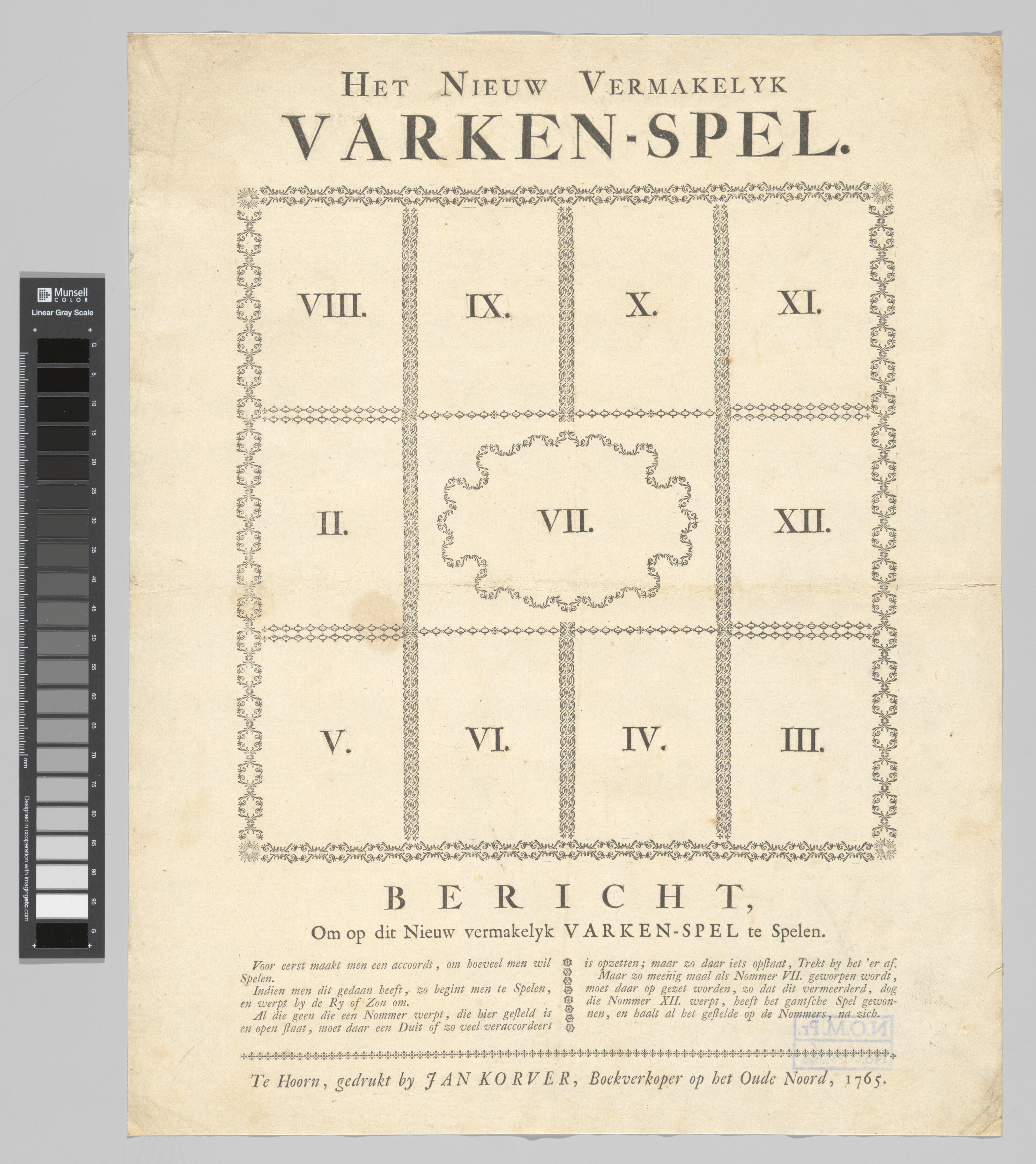 Bordspel, verdeeld in tien vakken rond een middenveld. In de tien vakken staan de Romeinse cijfers VIII, IX, X, XI, II, XII, V, VI, IV en III. In het midden staat het cijfer VII. Wie op de pot met nummer VII komt moet betalen. Er wordt gespeeld om een inzet: de winnaar is wie het ...