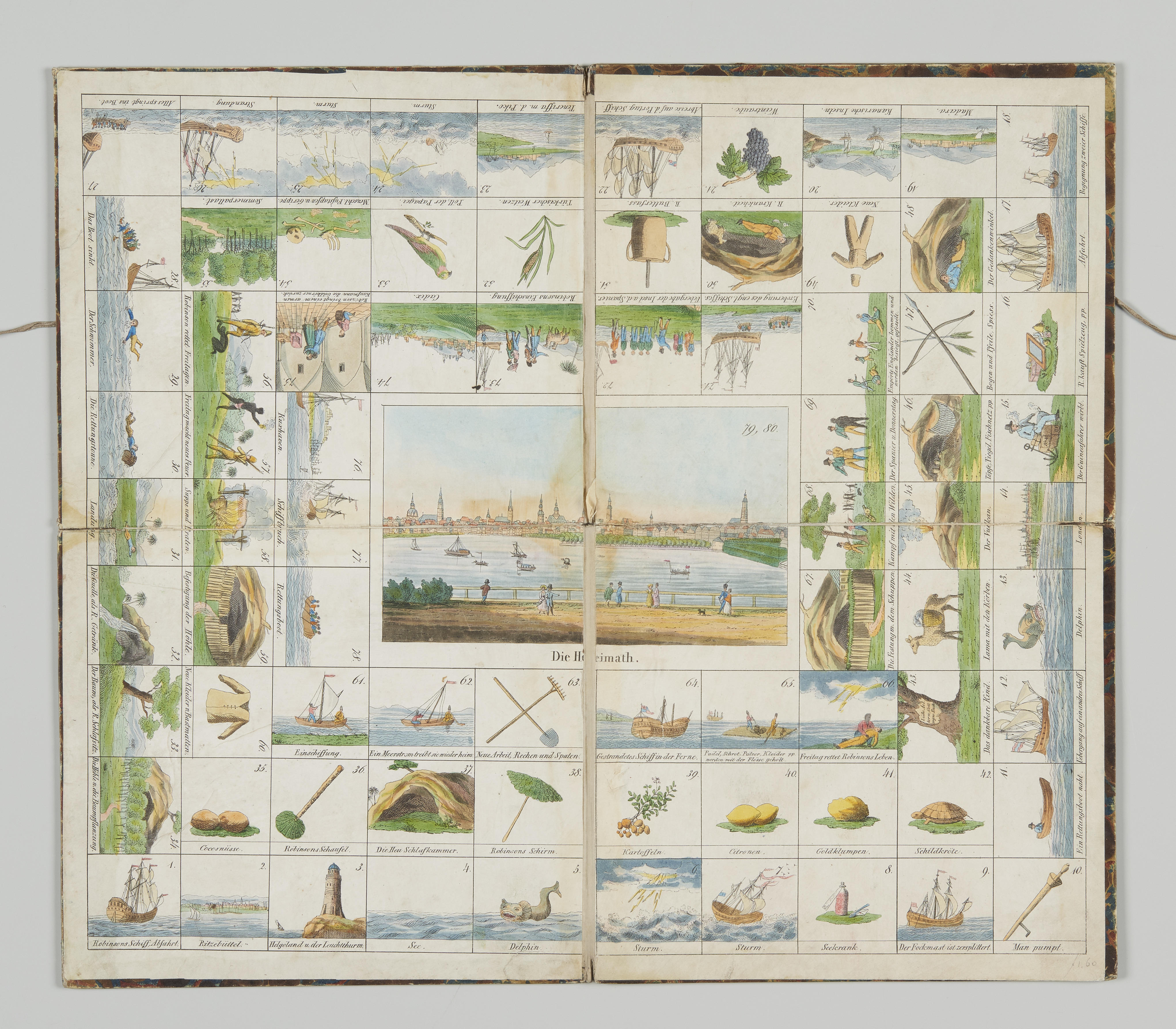 Bordspel over de verhalen van Robinson Crusoe met in het midden een voorstelling van de kade in Hamburg met schepen in het water en daaronder het opschrift: 'Die Heimath'.