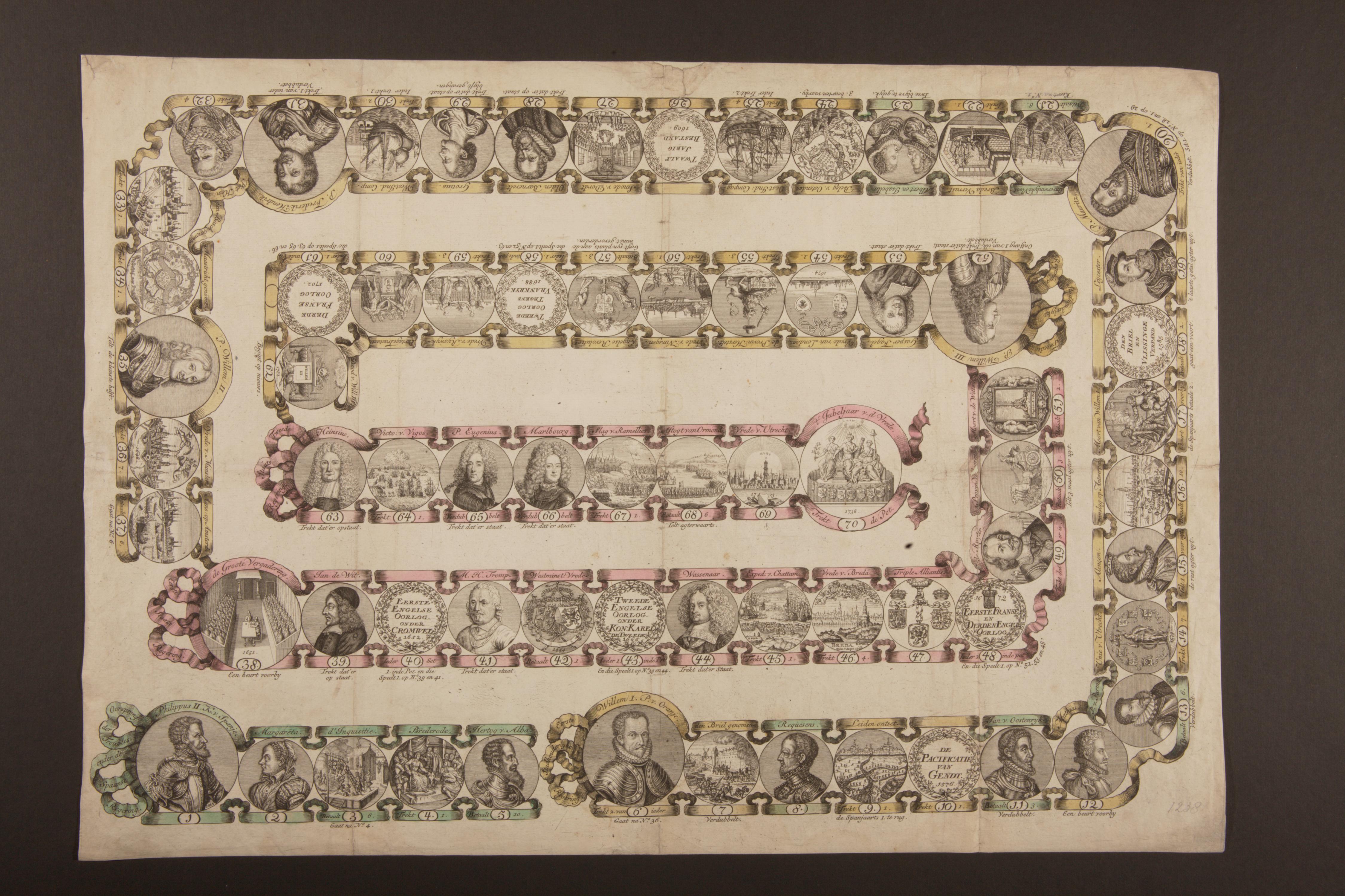 Bordspel met zeventig speelvakken over de belangrijke personen en gebeurtenissen uit de geschiedenis van de Nederlanden. Het eerste vakje heeft een afbeelding van Filips II (1527-1598). Vakje zeventig verbeeldt het jaar 1738, het Jubeljaar van de Vrede van Utrecht.