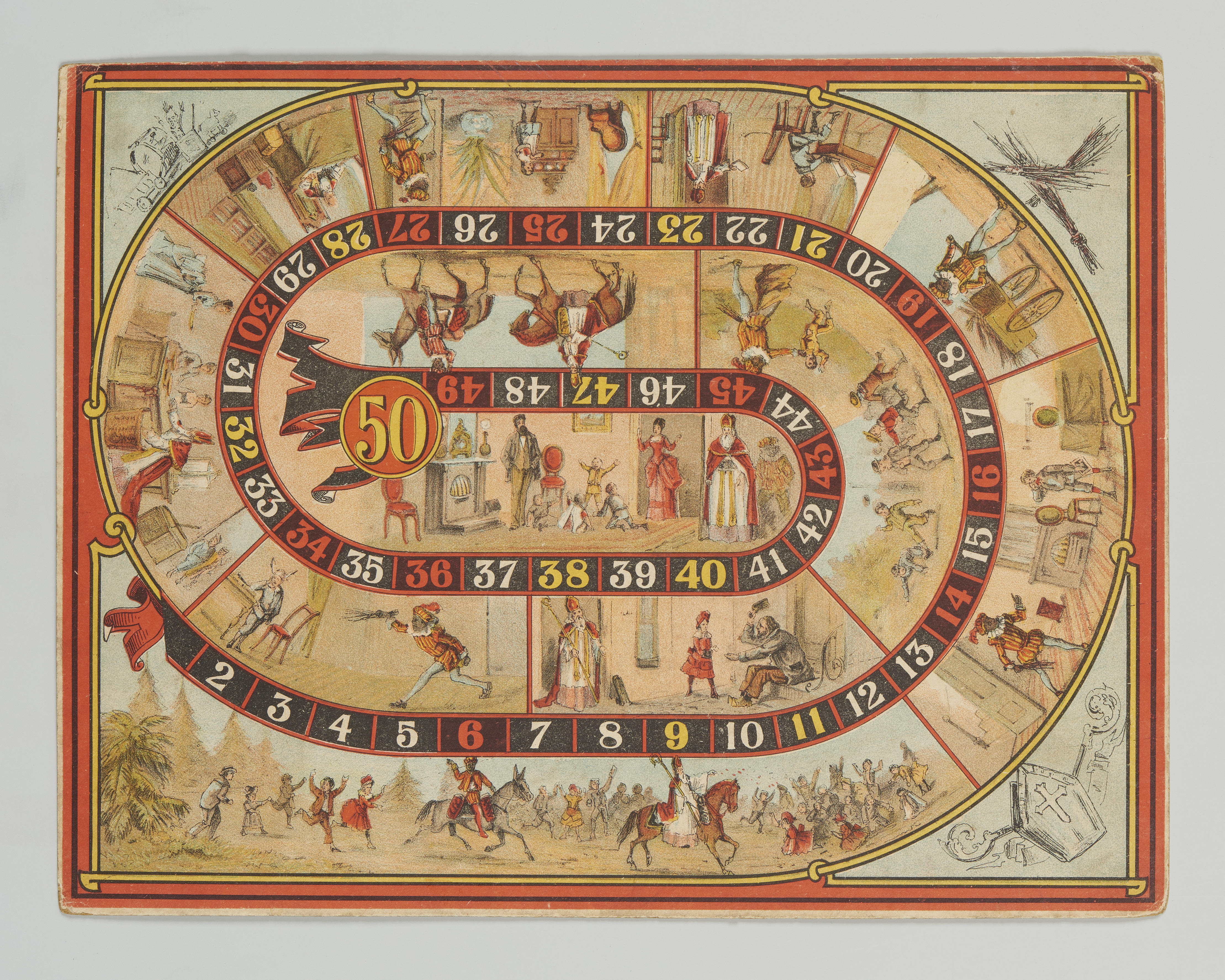 Ganzenbordachtig spel met vijftig speelvakken en in het midden een voorstelling van Sint en Zwarte Piet in een huiskamer met ouders en kinderen.
