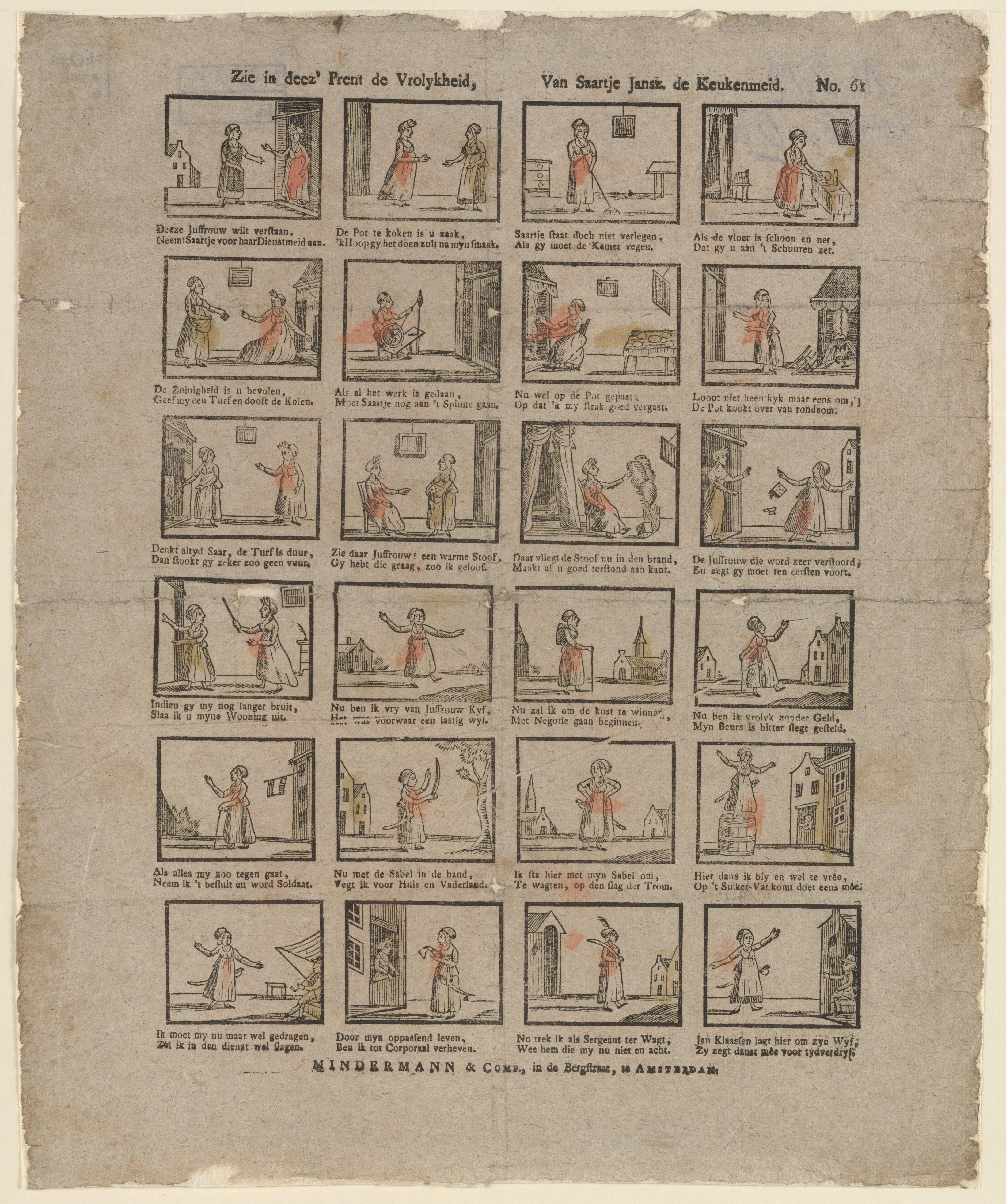 Prent met 24 afbeeldingen van het verhaal van Saartje Jans de keukenmeid, die na haar ontslag soldaat wordt. De prent is gedrukt met afzonderlijke houtsneden en ingekleurd met rood en geel. Onder iedere afbeelding staat een onderschrift, gedrukt in boekdruk. Deze prent komt voor zowel als nummer 61 voor in het fonds van Van Bergen ...
