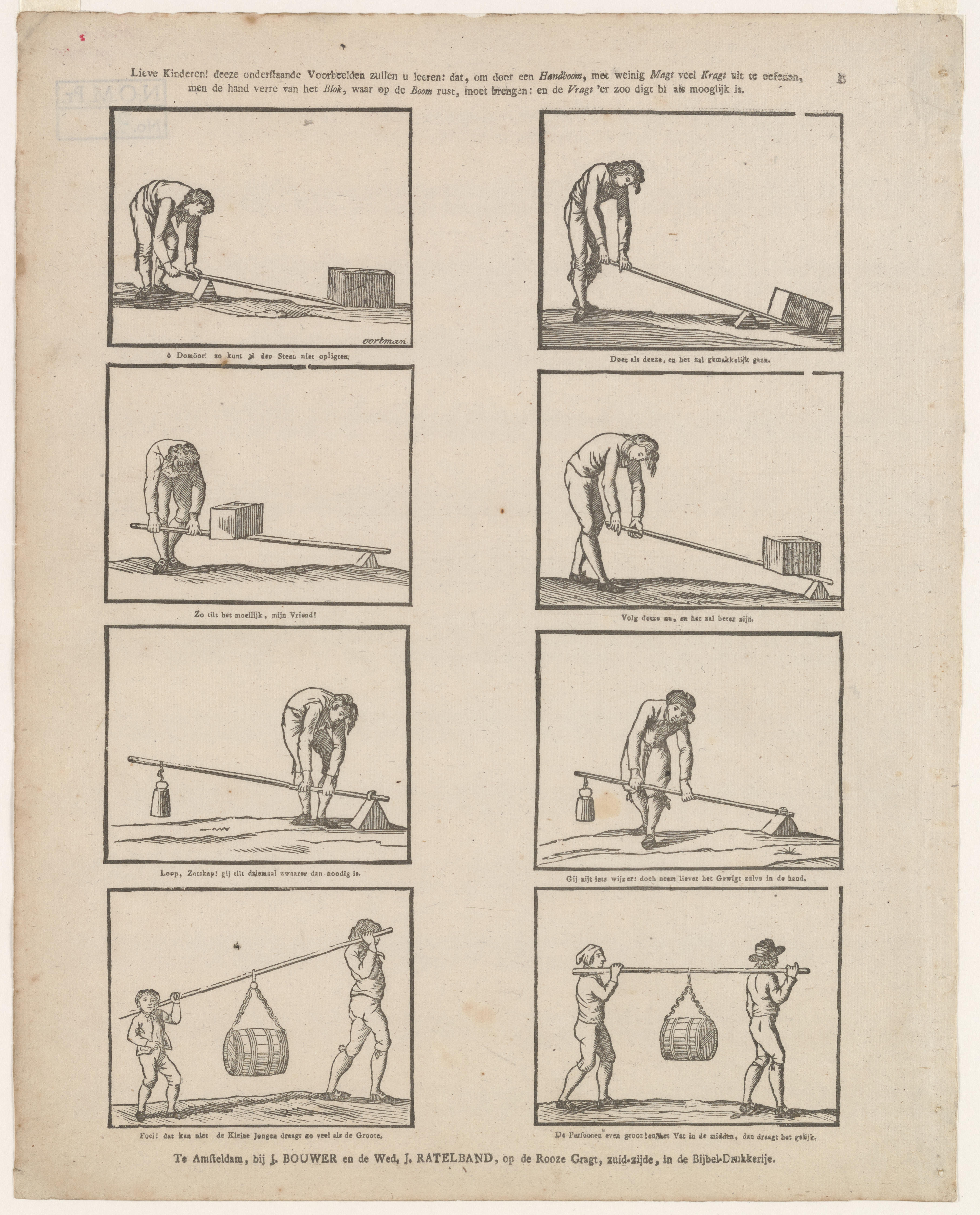 Lieve Kinderen! deeze onderstaande Voorbeelden zullen u leeren: dat, om door een Handboom, met weinig Magt veel Kragt uit te oefenen, men de hand verre van het Blok, waar op de Boom rust, moet brengen: en de Vragt er zoo digt bij als mooglijk is. - B