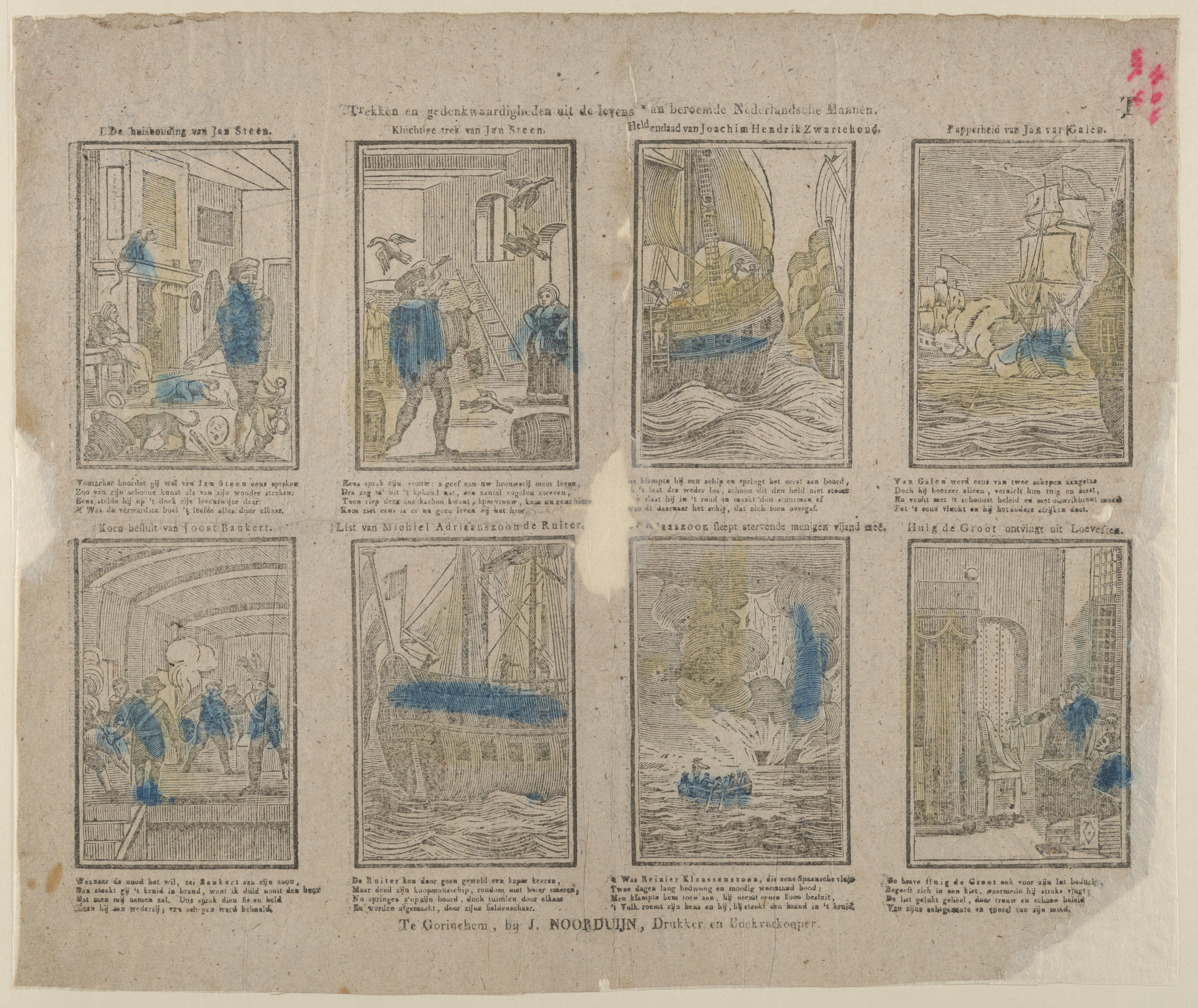 Prent met acht afbeeldingen van beroemde mannen uit de Nederlandse geschiedenis, gedrukt met afzonderlijke houtsneden en ingekleurd met blauw en geel. Boven iedere afbeelding staat een titel en onder elke afbeelding een onderschrift. Beide zijn gedrukt in boekdruk.