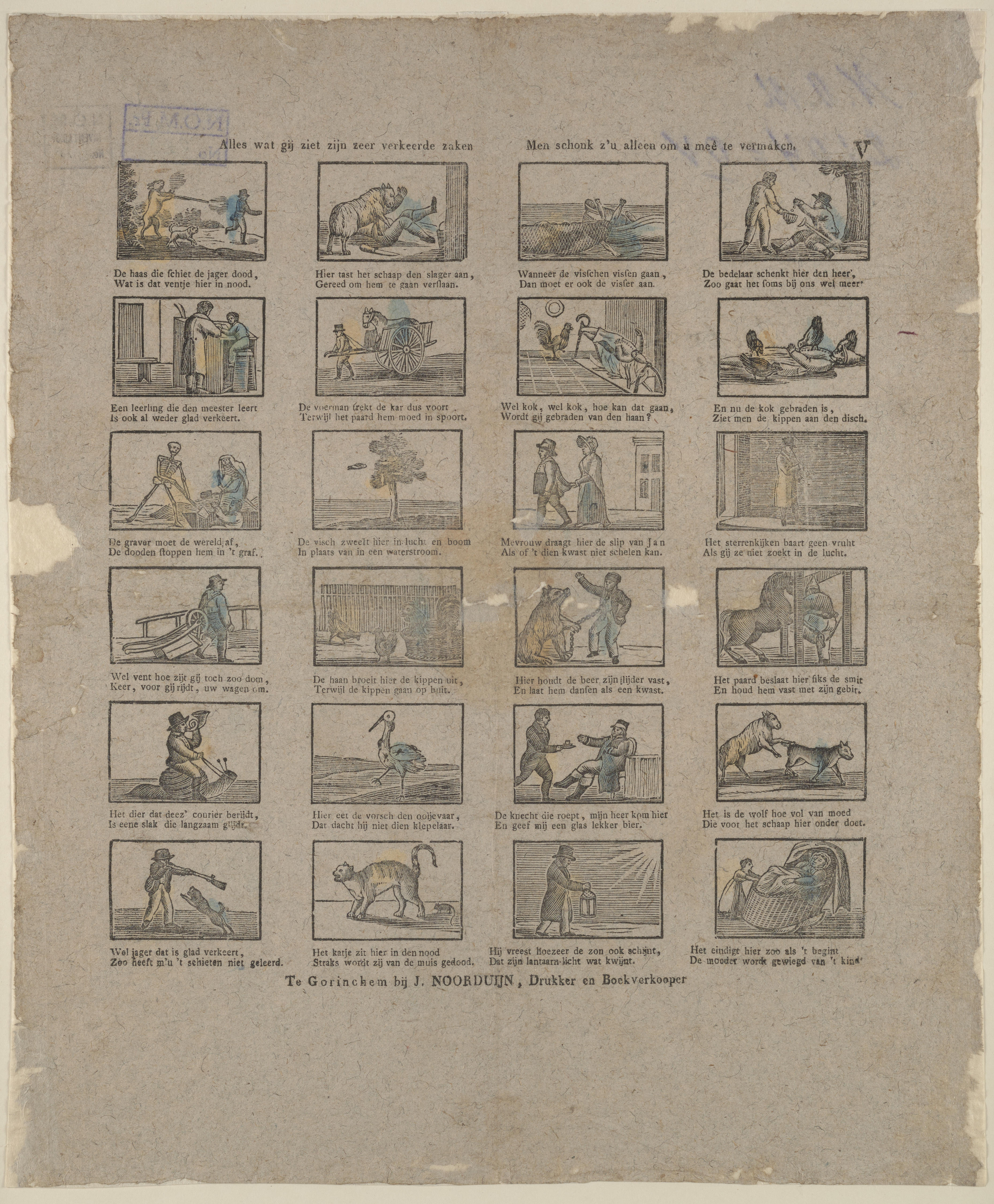 Prent met 24 afbeeldingen van de zogenoemde Verkeerde Wereld, gedrukt met afzonderlijke houtsneden en ingekleurd met blauw en geel. Onder iedere afbeelding staat een onderschrift, gedrukt in boekdruk.