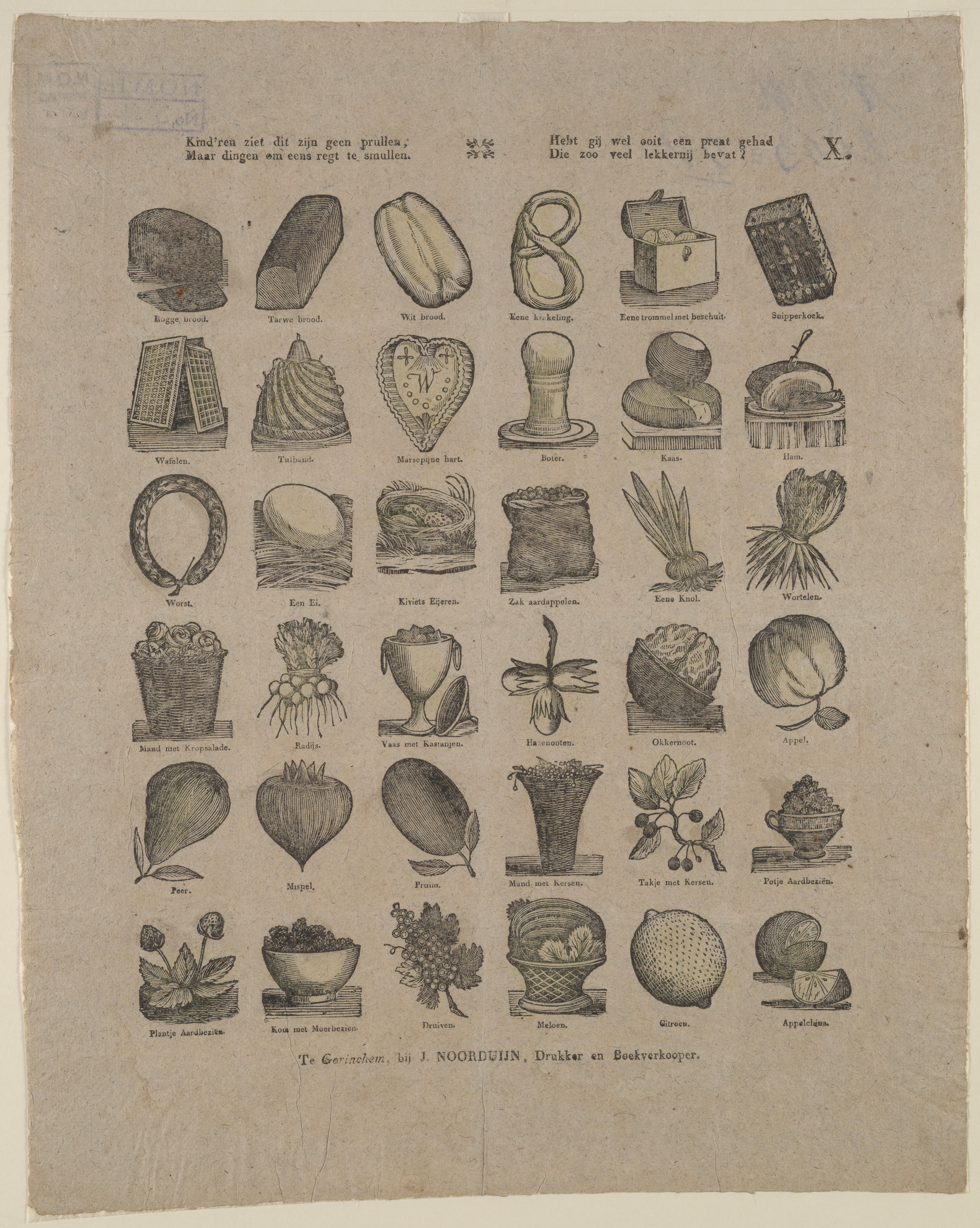 Kind'ren ziet dit zijn geen prullen, / Maar dingen om eens regt te smullen. // Hebt gij wel ooit een prent gehad / Die zoo veel lekkernij bevat? - X