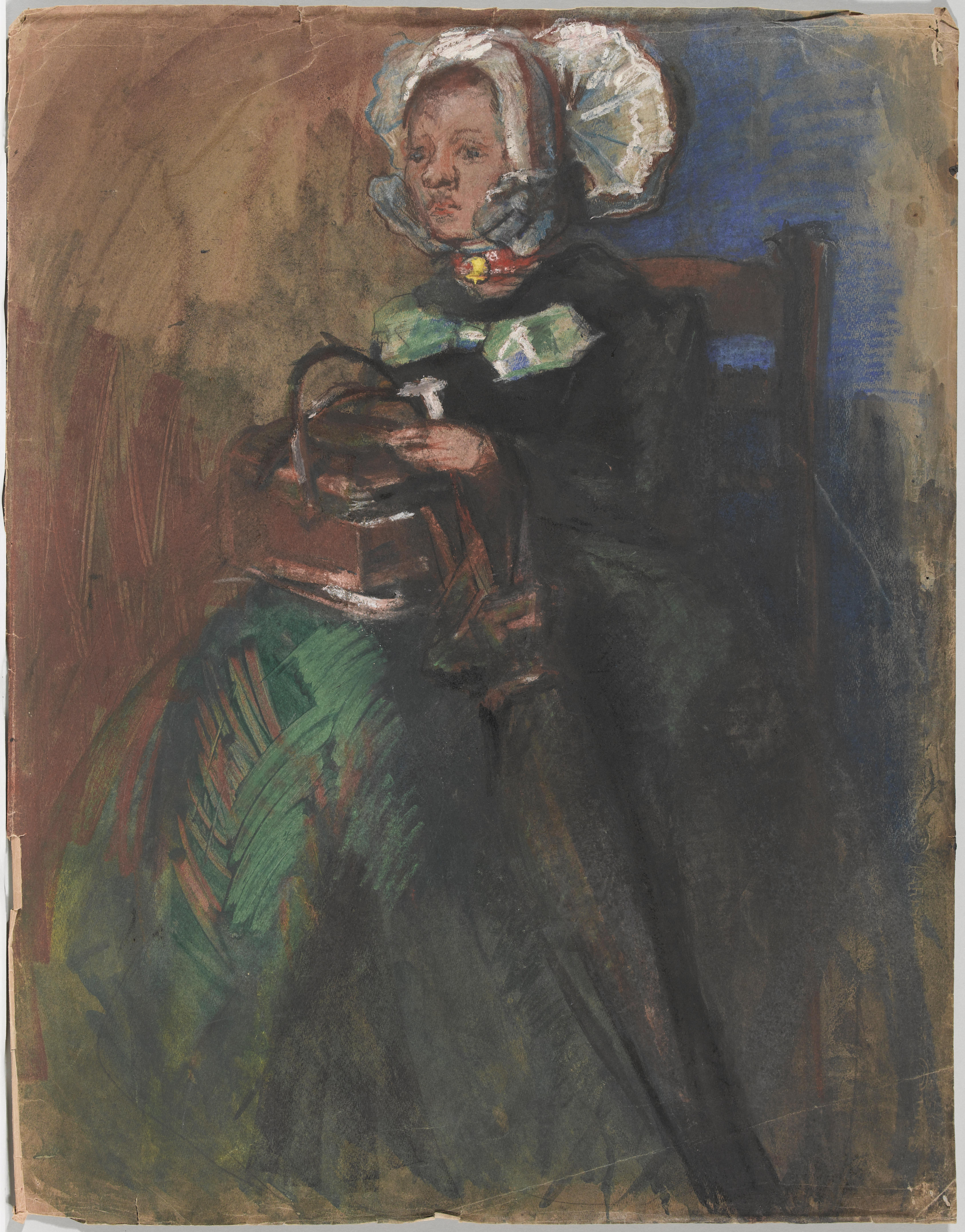 Pastel met een voorstelling van een zittende vrouw van de Veluwe met een gevlochten karbies op schoot en een paraplu tegen haar benen gesteund. De schilder Martin Monnickendam werkte voornamelijk buiten Nederland. In 1913 werkte en verbleef hij in Empe. Waarschijnlijk is deze pastel in dat jaar te dateren en heeft een meisje uit die ...