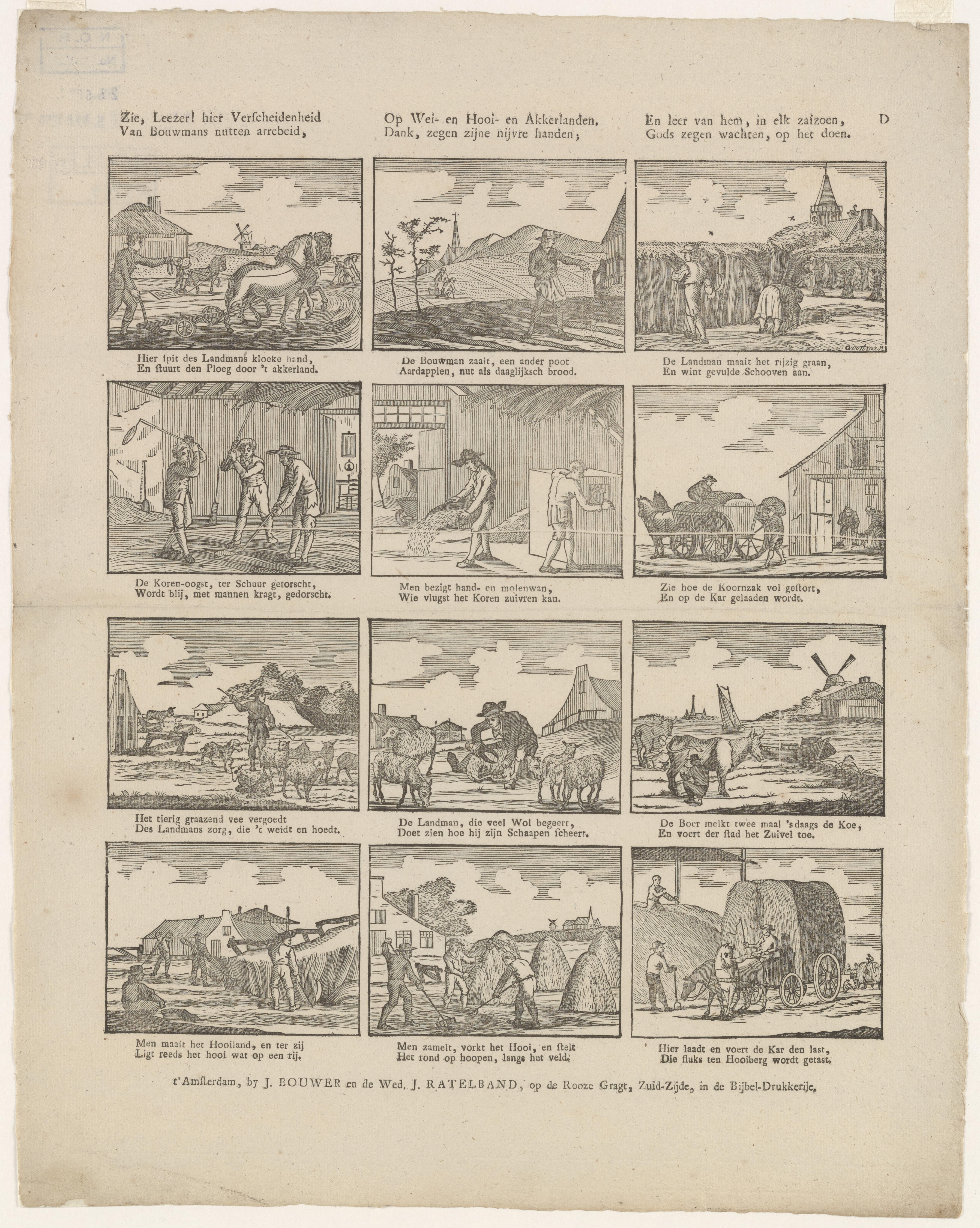 Prent met twaalf voorstellingen van de landbouw, gedrukt met afzonderlijke houtsneden. Onder elke afbeelding staat een tweeregelig onderschrift, gedrukt in boekdruk. In de derde afbeelding staat de signatuur van graveur Gerrit Oortman.