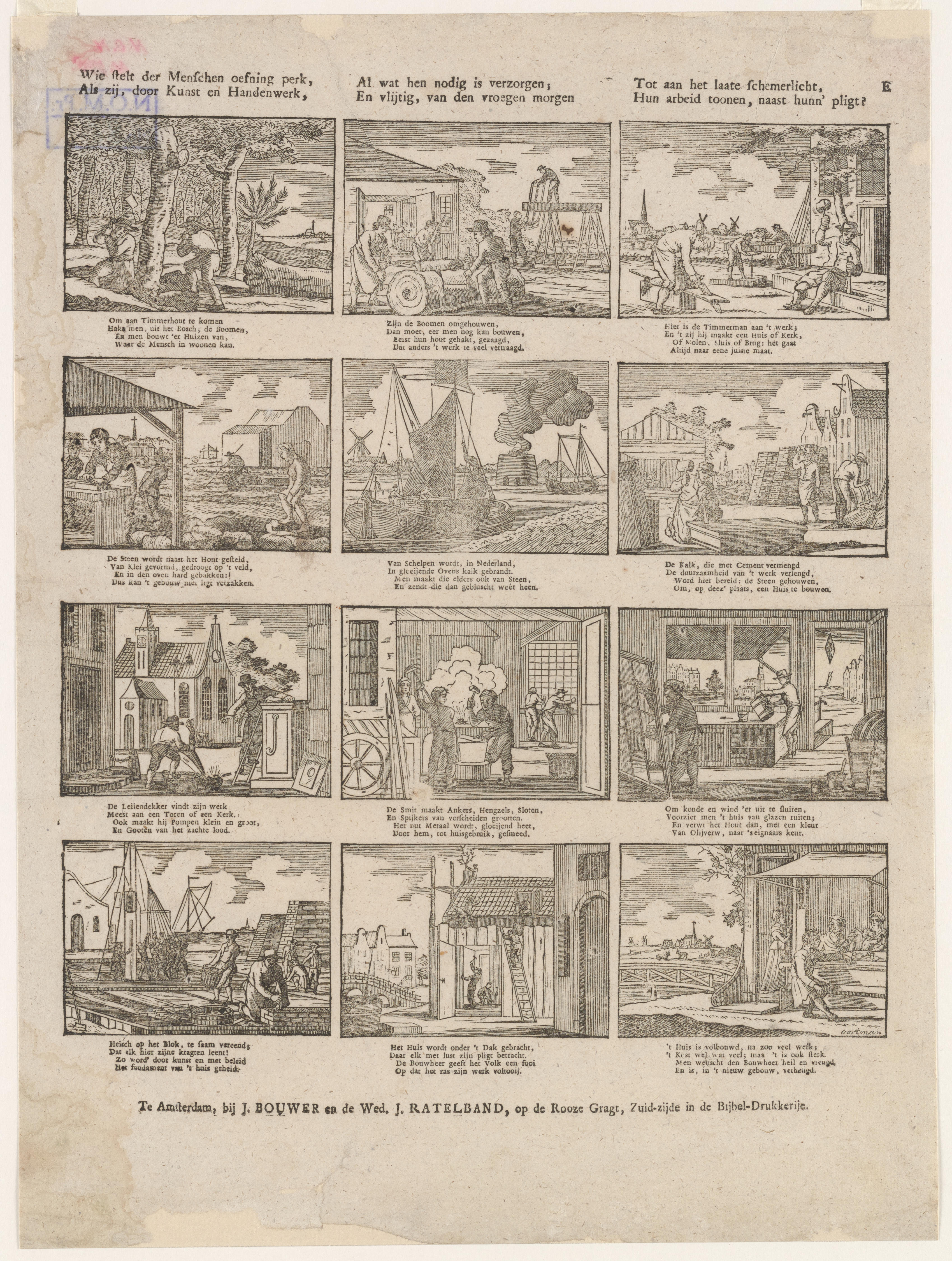 Prent met twaalf voorstellingen van verschillende ambachten, gedrukt met afzonderlijke houtsneden. Onder elke afbeelding staat een vierregelig onderschrift, gedrukt in boekdruk. In de twaalfde afbeelding staat de signatuur van graveur Gerrit Oortman.