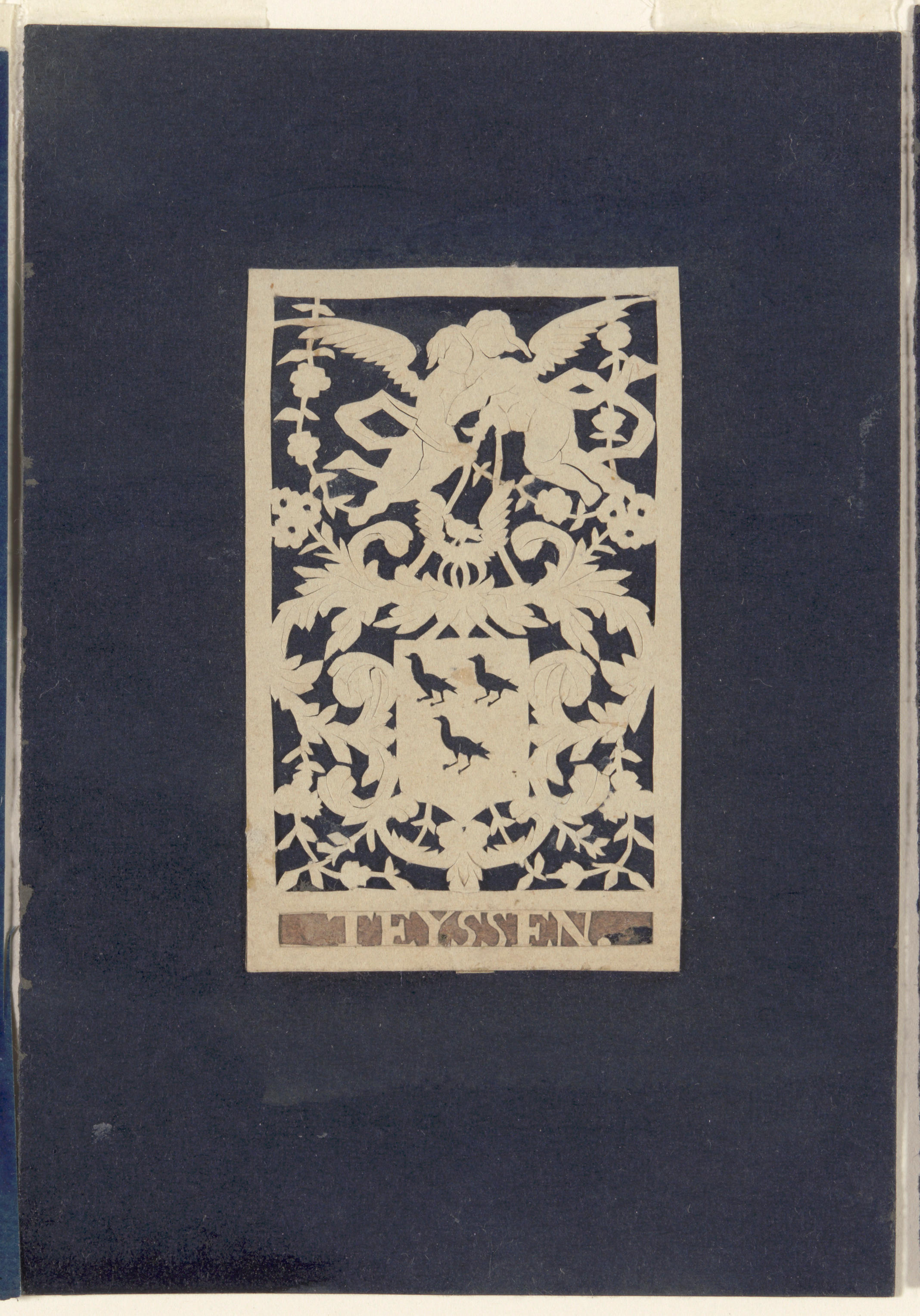 Knipsel van een familiewapen. Het wapen met drie vogels is omringd door bladranken. Erboven staat een helmteken met een vogel. Het geheel wordt door twee engelen aan koorden gedragen. Onderin staat de naam: 'TEYSSEN'.
