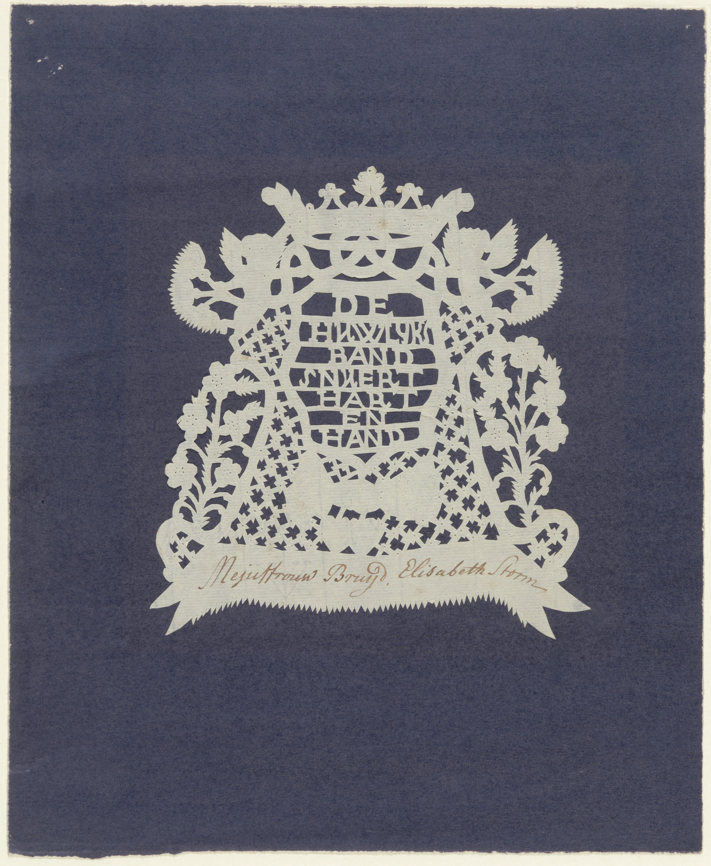 Knipsel met de tekst: 'De huwelijksband snuert hart en hand' en de naam van de bruid: 'Mejuffrouw Bruijd, Elisabeth Storm'. Dit knipsel is gebruikt als plaatsaanduiding tijdens het huwelijksdiner. Het is versierd met harten, twee handen en engelen die de huwelijkskroon vasthouden.