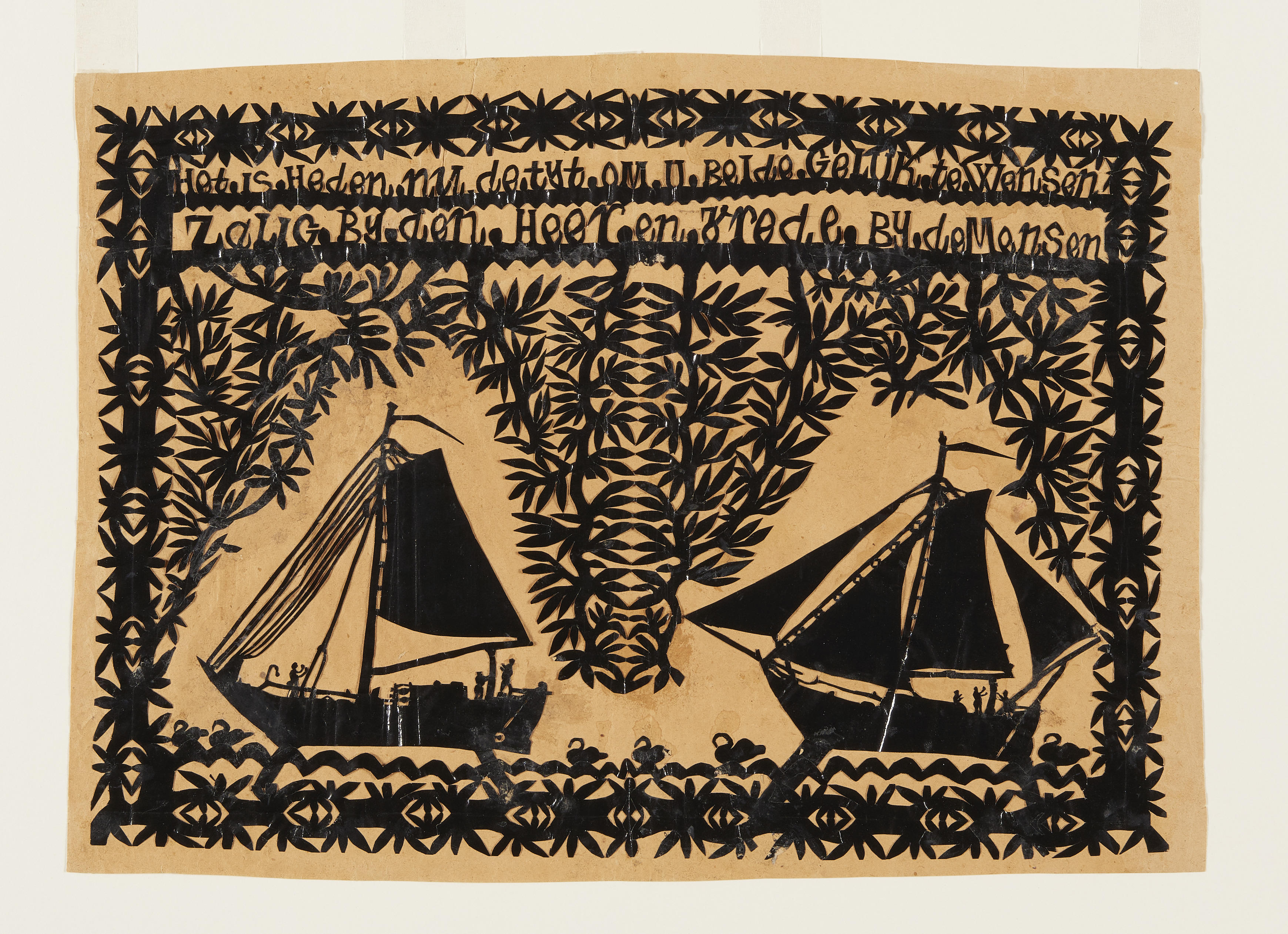 Knipsel van twee botters tussen takmotieven, met kenmerkende randmotieven en -versiering. De schepen en de tekst zijn in het knipsel geplakt. De teksten knipte Jan de Knipper aan de meter en de schepen knipte hij in serie. Het knipsel is als geschenk gegeven bij een huwelijk. Bovenin is de tekst te lezen: 'Het is heden ...