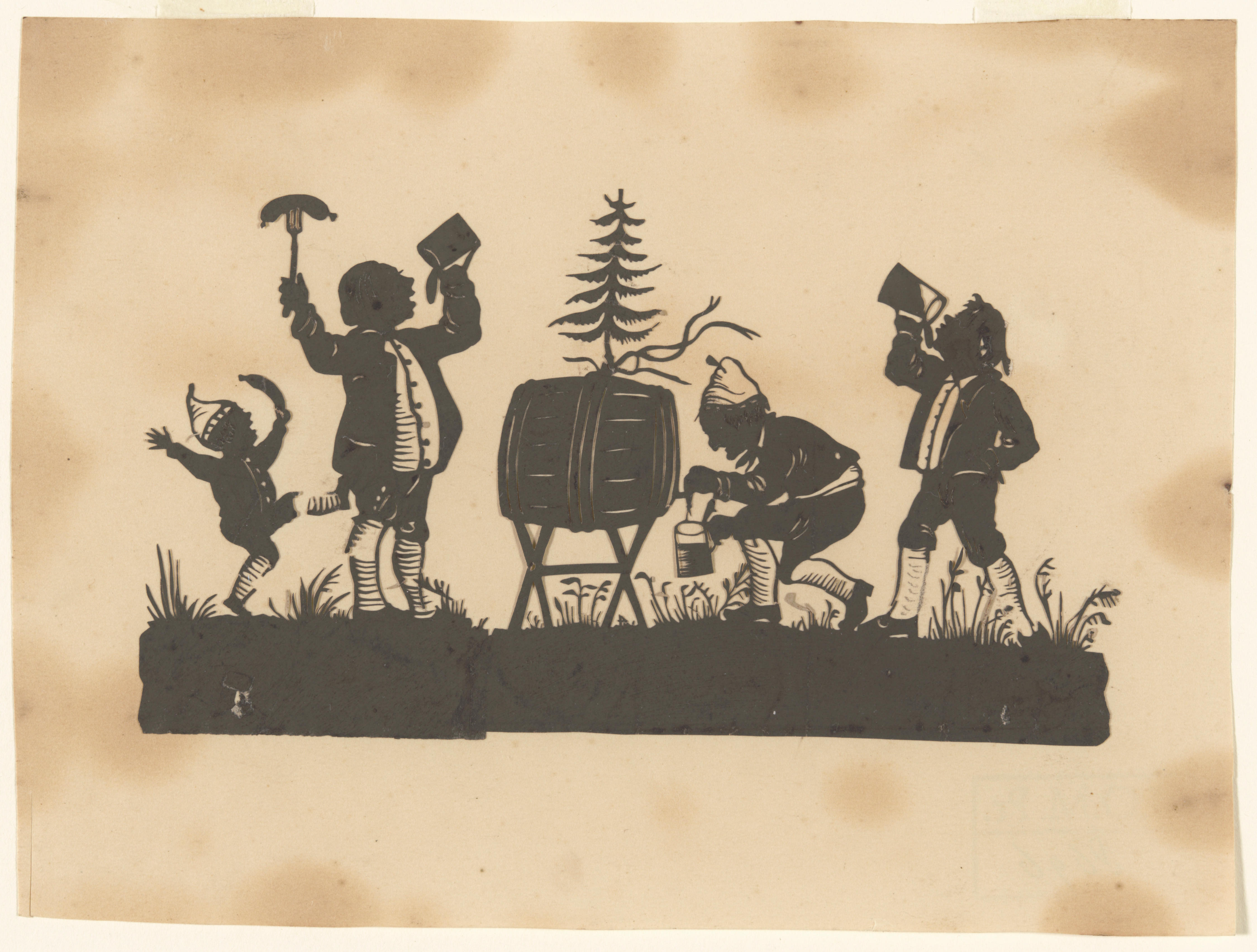 Knipsel van een bierfeest in een weiland met twee drinkende mannen, een man die tapt uit een biervat en een dansend jongetje met een worst.