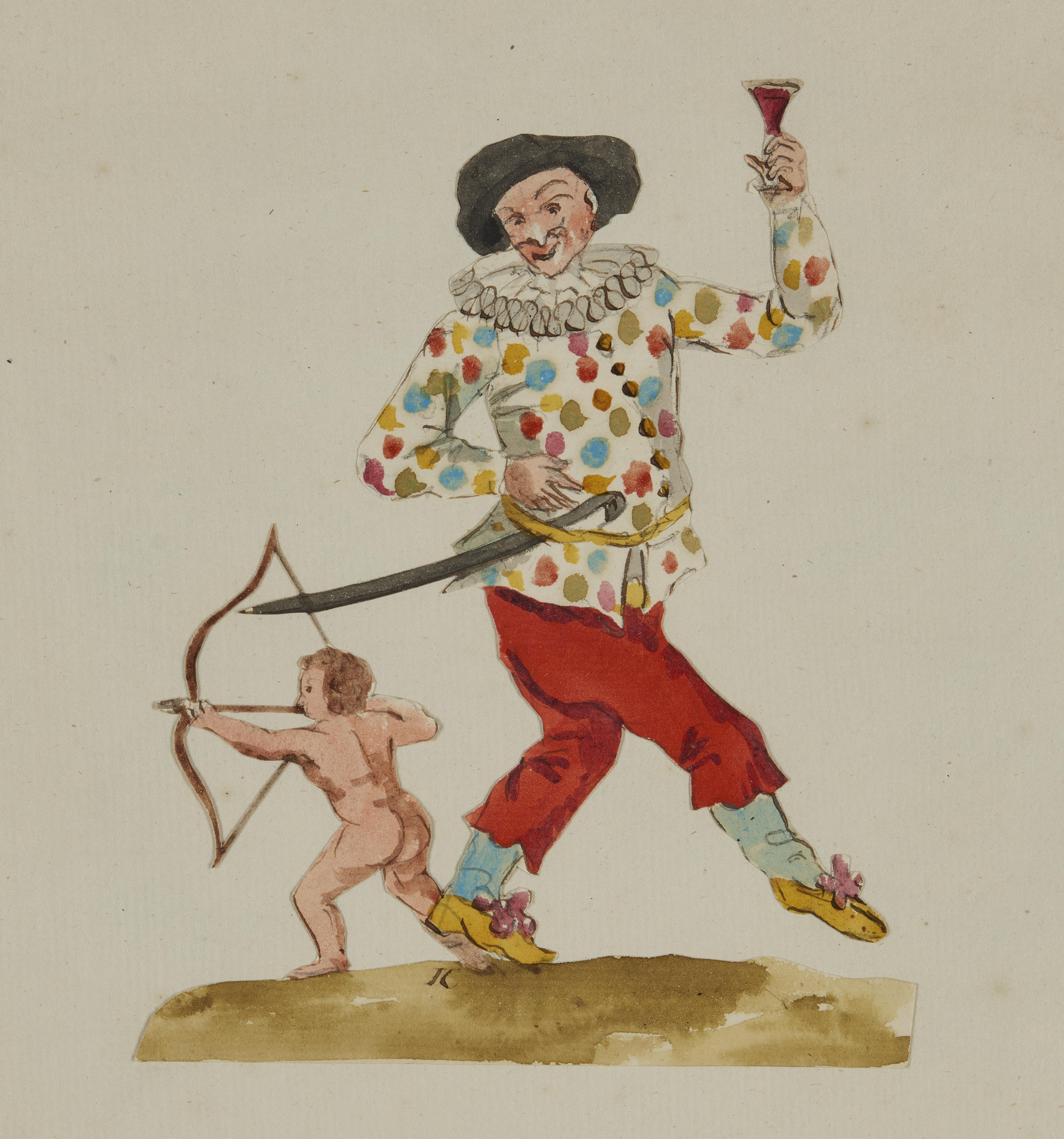 Clown danst met een glaasje, terwijl cupido een pijl afschiet.