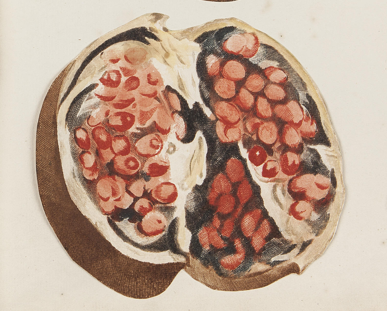 Een uitgeknipte, ingekleurde ets van een granaatappel.