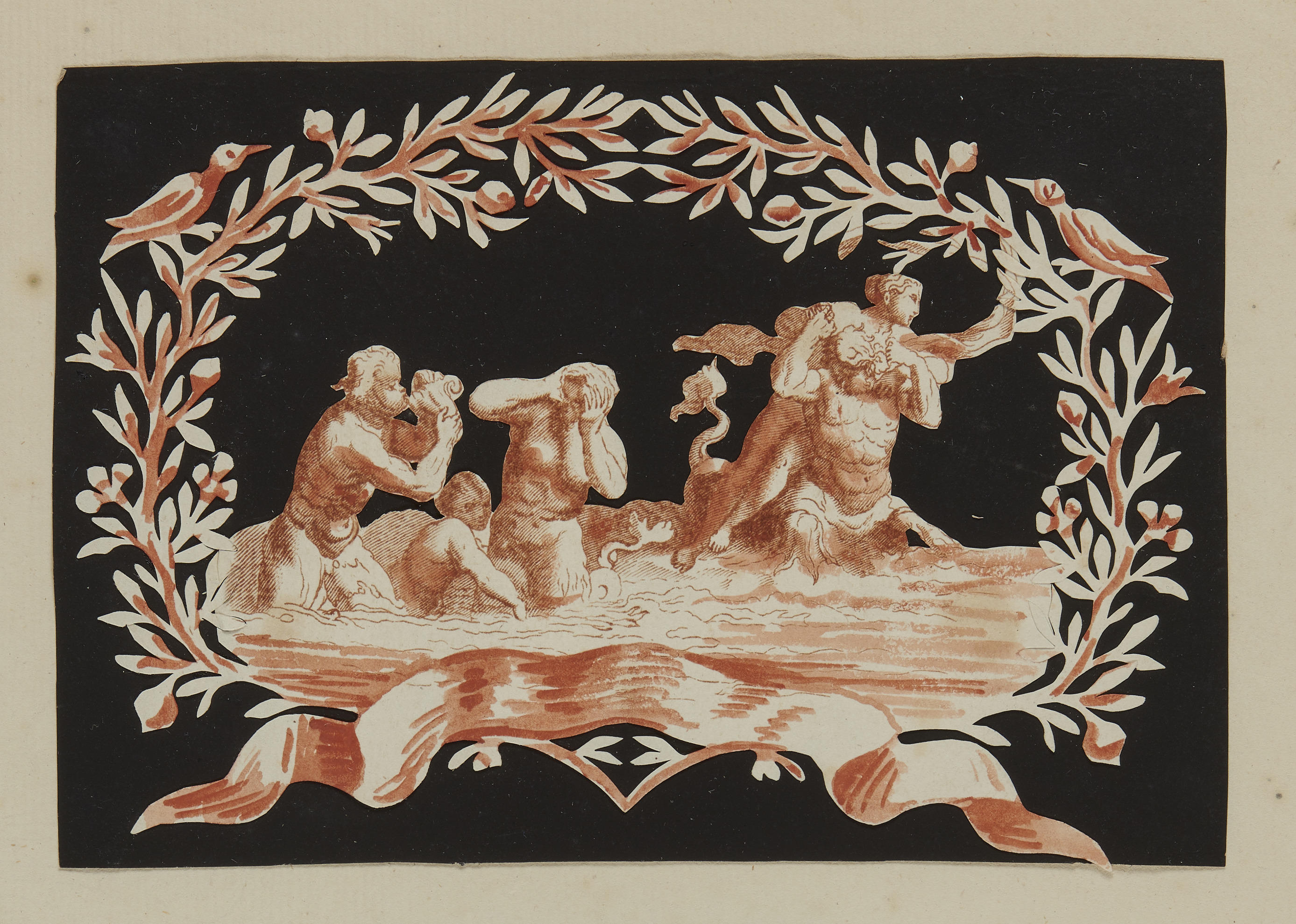 Uitgeknipte mythologische scène, vermoedelijk Bacchus met gevolg.