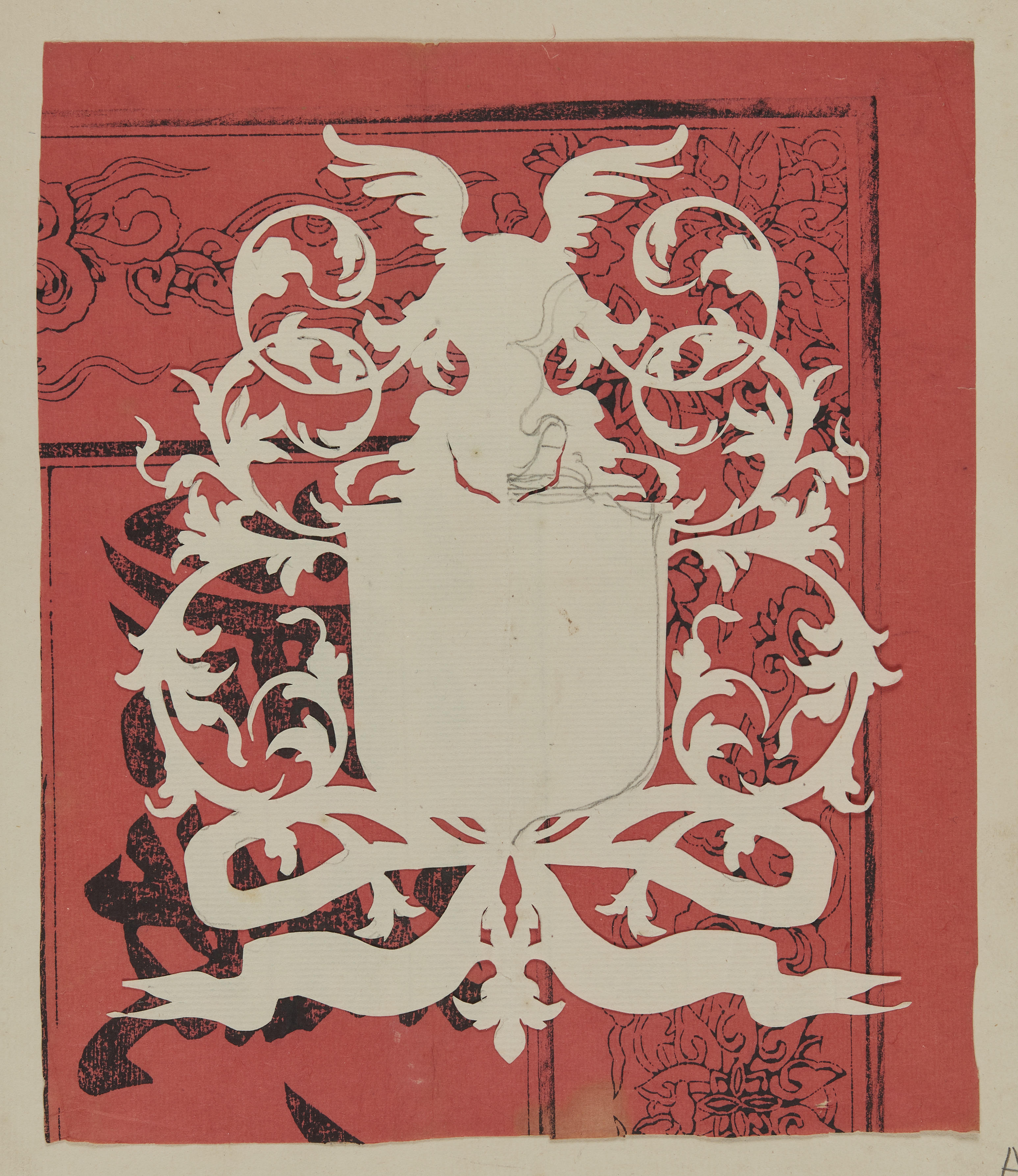Wapen op rood papier met zwarte Chinese tekens.