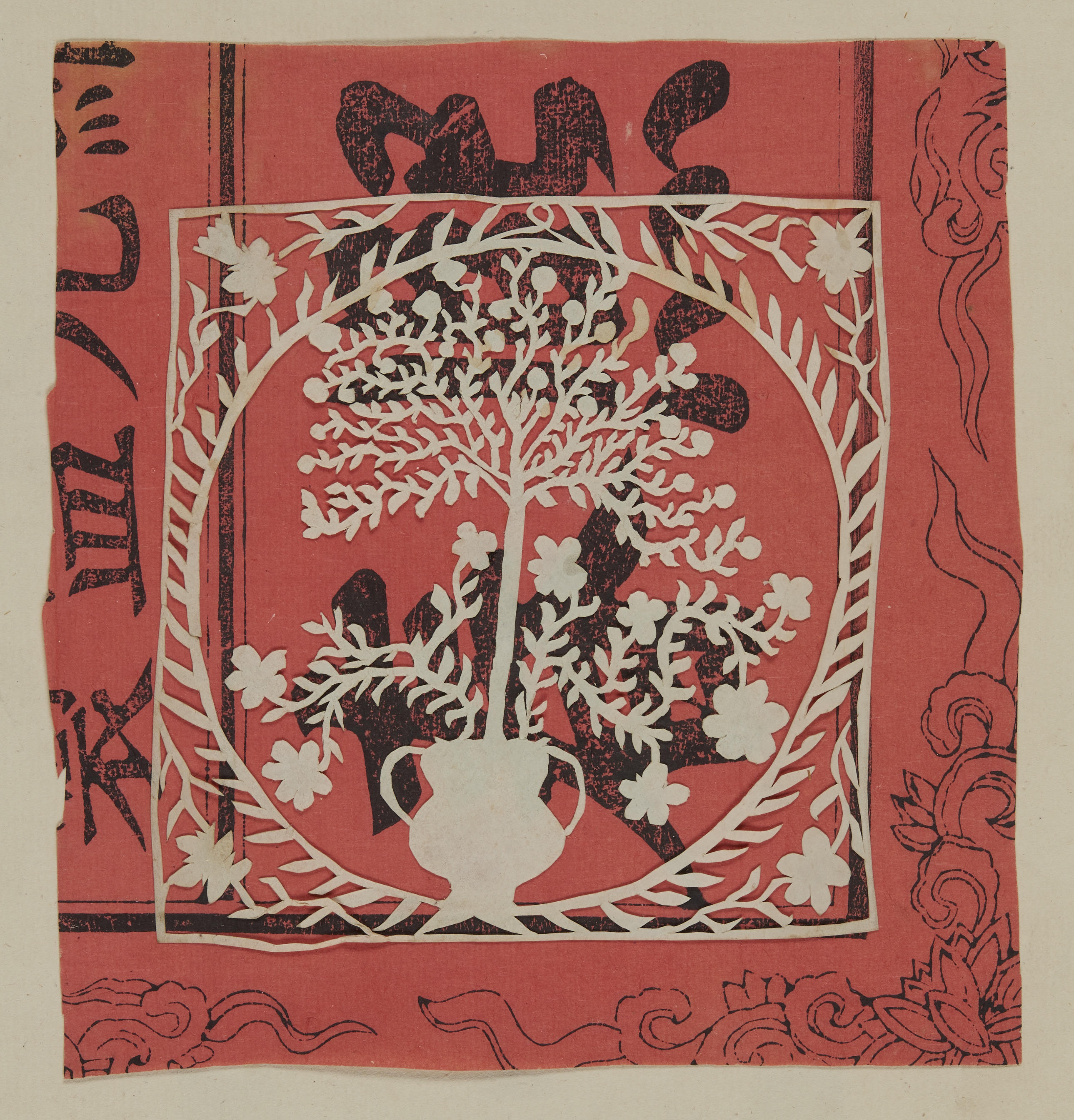 Uitgeknipt plantmotief, gemonteerd op rood papier met Chinese tekens.