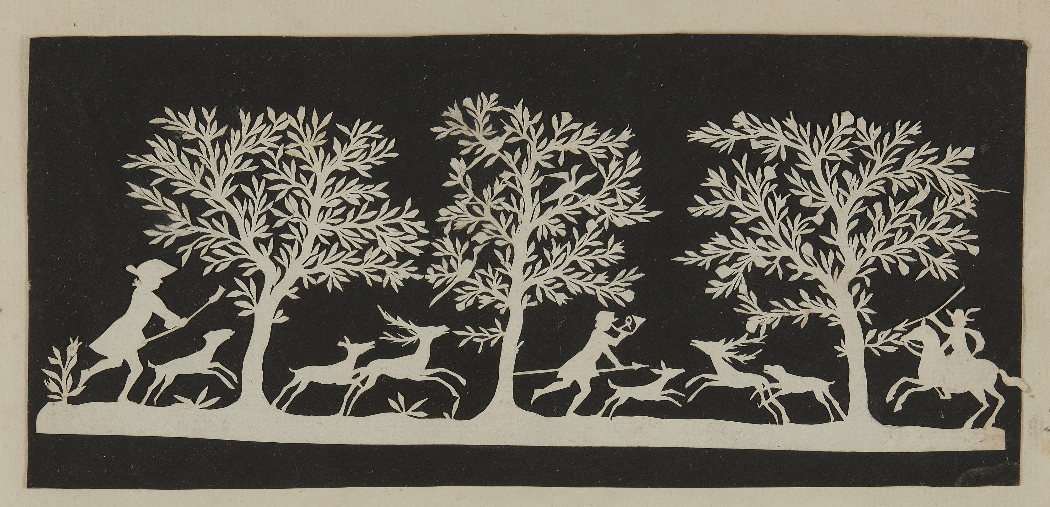Drie jagers jagen met honden op herten. In de achttiende eeuw werden jachtscènes steeds populairder, onder andere in interieurschilderingen. Dit knipsel is hiervan een afgeleide.