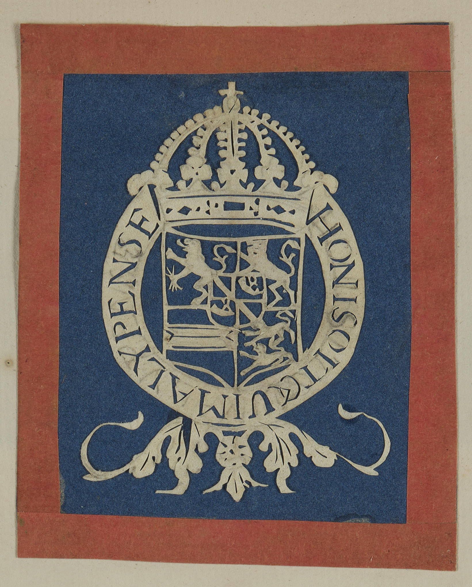 Het knipsel toont het wapen van Oranje-Nassau, weergegeven onder een kroon met vijf beugels en omgeven door een band met het opschrift: 'HONI SOIT QU I MAl Y PENSE', de spreuk van de Orde van de Kousenband. Dit wapen is niet helemaal correct weergegeven. Zo ontbreken de gesp en lip die onderaan hoort te zitten ...
