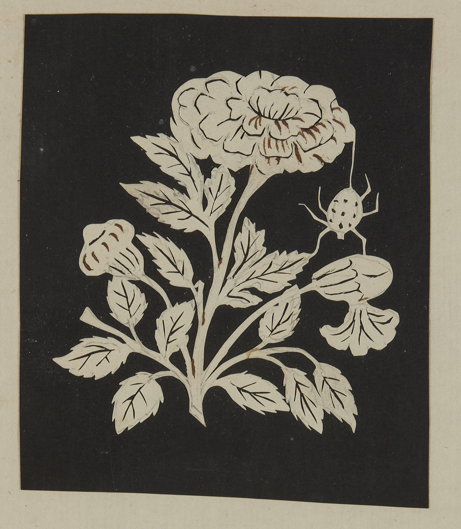 Knipsel van een spin, hier afgebeeld met zes poten, hangend aan een roos.