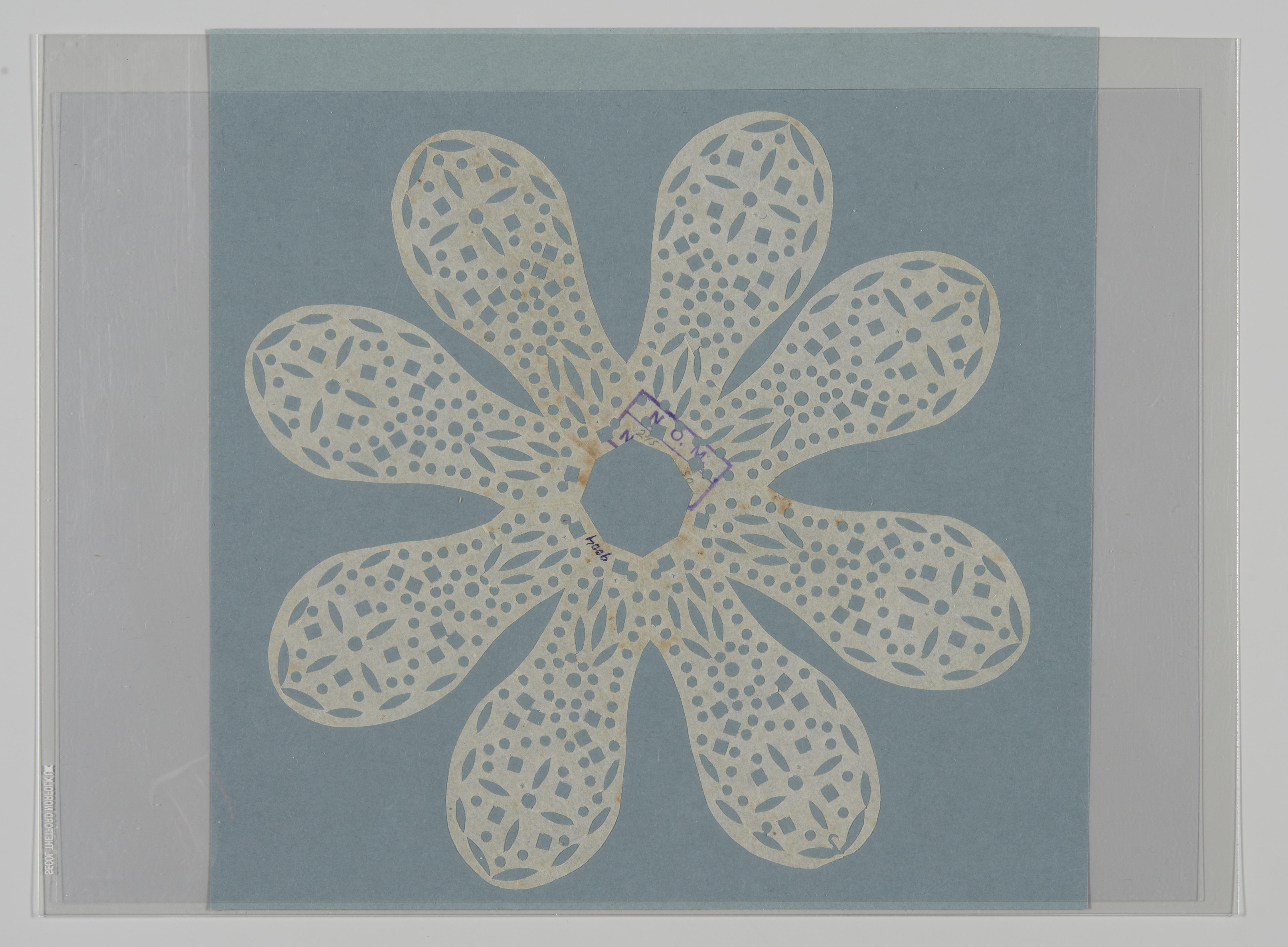 Driemaal gevouwen knipwerk uit dun papier, bedoeld voor op een lampenkapje. Lampenkapkleedjes werden gemaakt na de winter, na de grote schoonmaak.