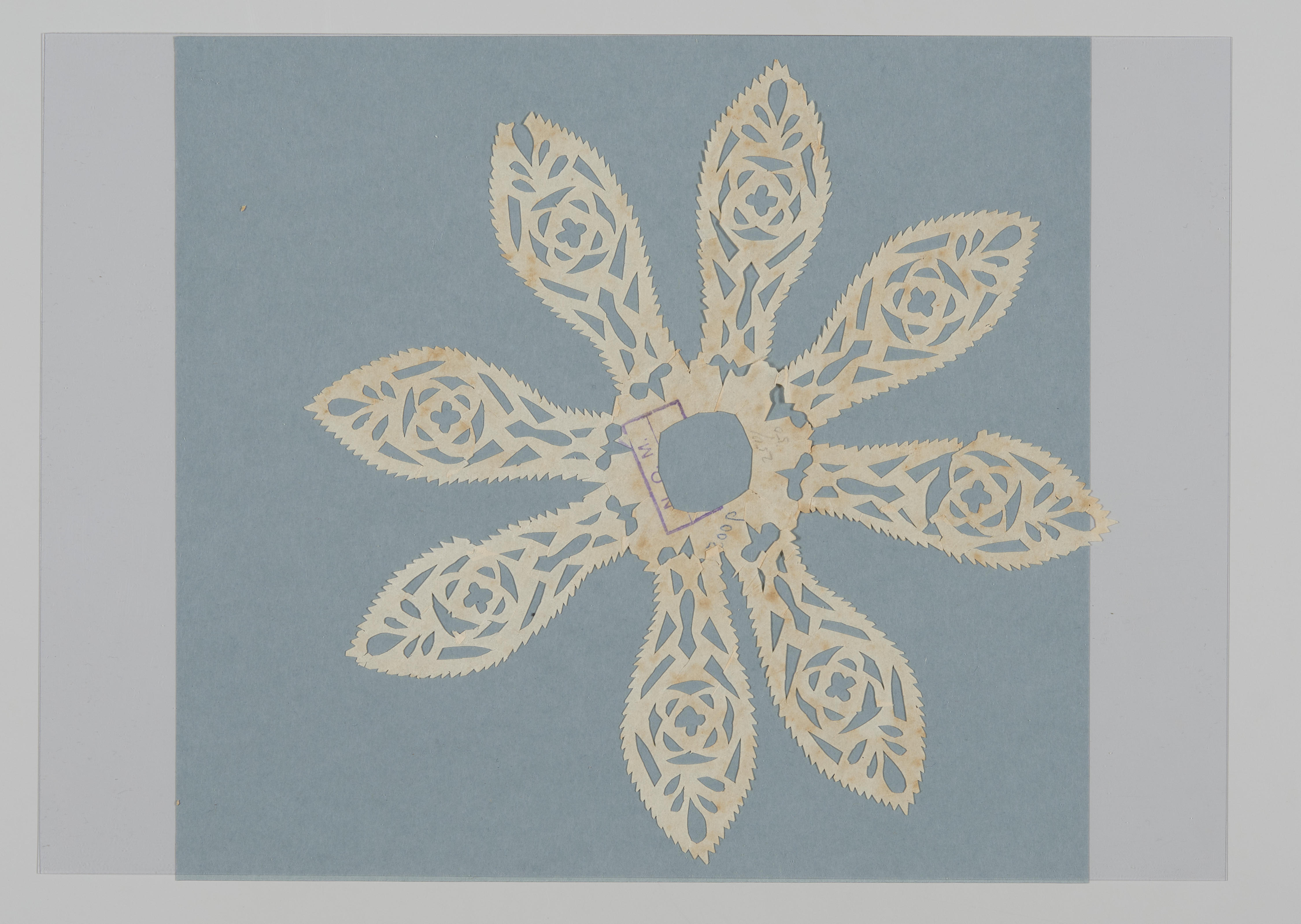Driemaal gevouwen knipwerk uit dun papier, bedoeld voor op een lampenkapje. Lampenkapkleedjes werden gemaakt na de winter, na de grote schoonmaak.
