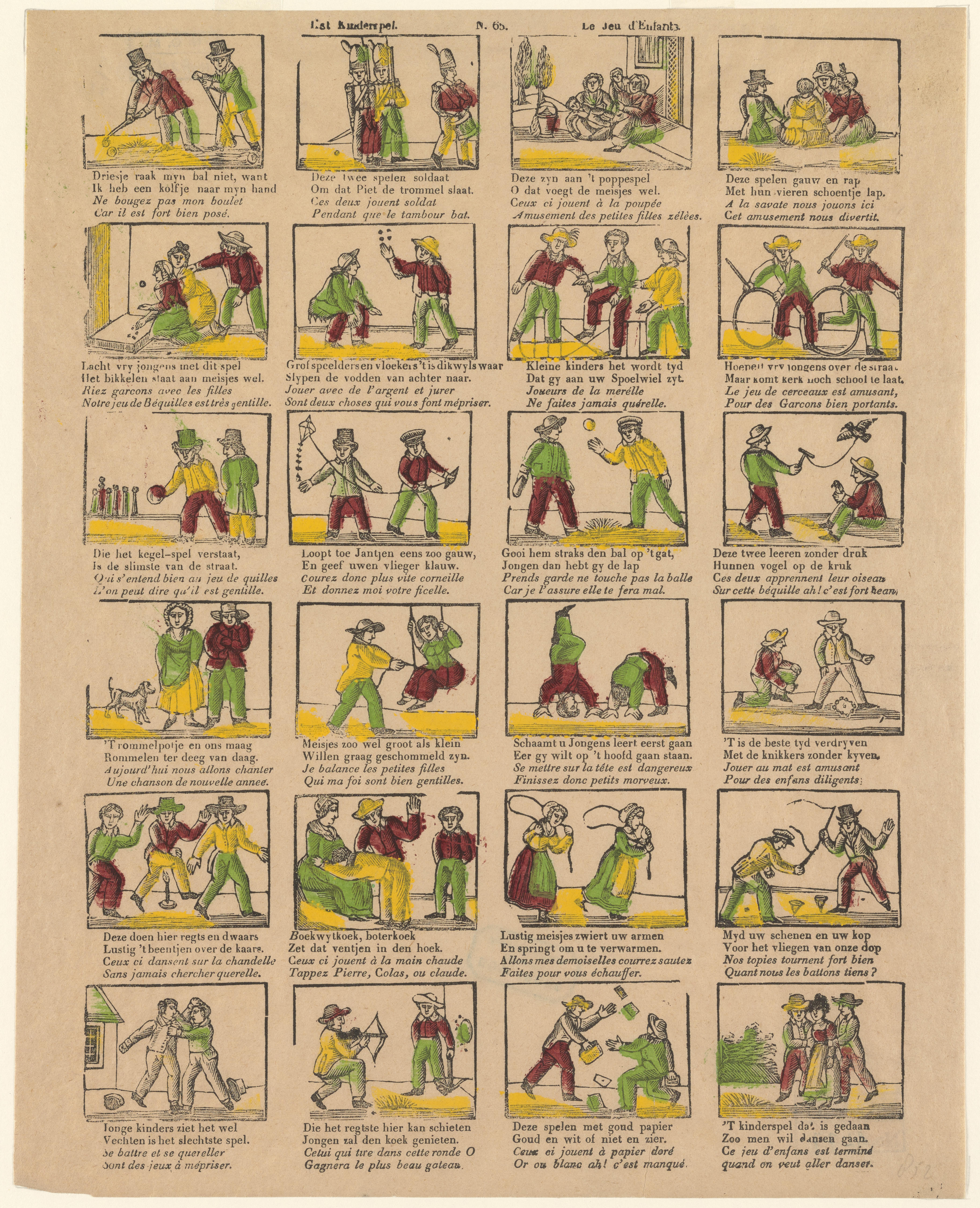Prent met 24 afbeeldingen van kinderspelen, gedrukt met afzonderlijke houtsneden en ingekleurd met groen, rood en geel. Onder elke afbeelding staat een onderschrift in het Nederlands en het Frans, gedrukt in boekdruk. Op de prent is geen uitgever vermeld. De prent is toegeschreven aan Wellens, Delhuvenne & Co in Turnhout.