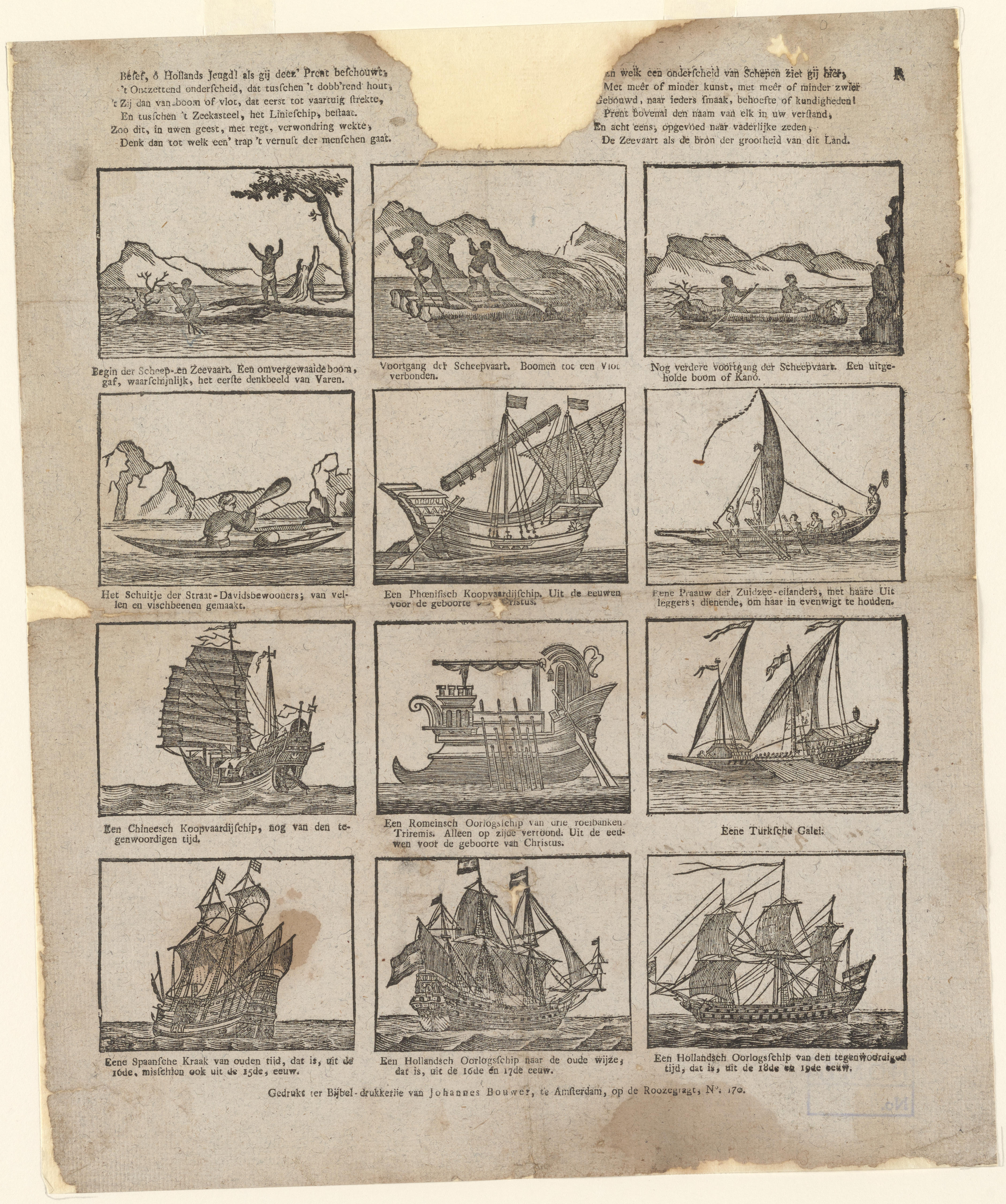 Prent met twaalf voorstellingen van verschillende soorten boten en schepen, gedrukt met afzonderlijke houtsneden. Onder elke afbeelding staat een onderschrift. Aan de bovenrand is een deel weggescheurd. Hier zat waarschijnlijk het zegel van de Maatschappij tot Nut van 't Algemeen.