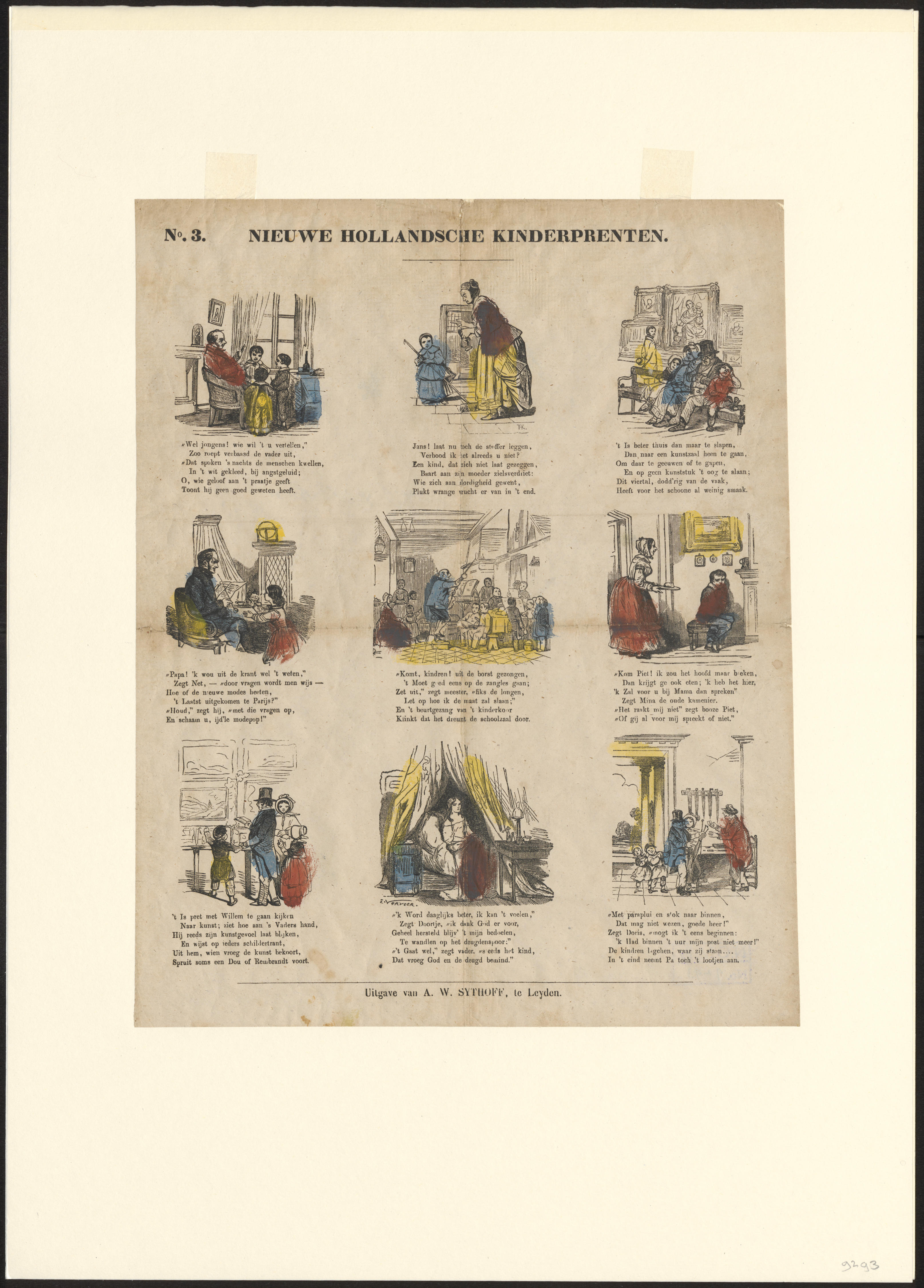 Prent met negen afbeeldingen van verschillende taferelen, gedrukt met afzonderlijke houtgravures en ingekleurd met rood, geel en blauw. Onder iedere afbeelding staat een onderschrift, gedrukt in boekdruk. De signatuur TK staat in afbeelding twee en de signatuur van E. Verveer staat in afbeelding acht.