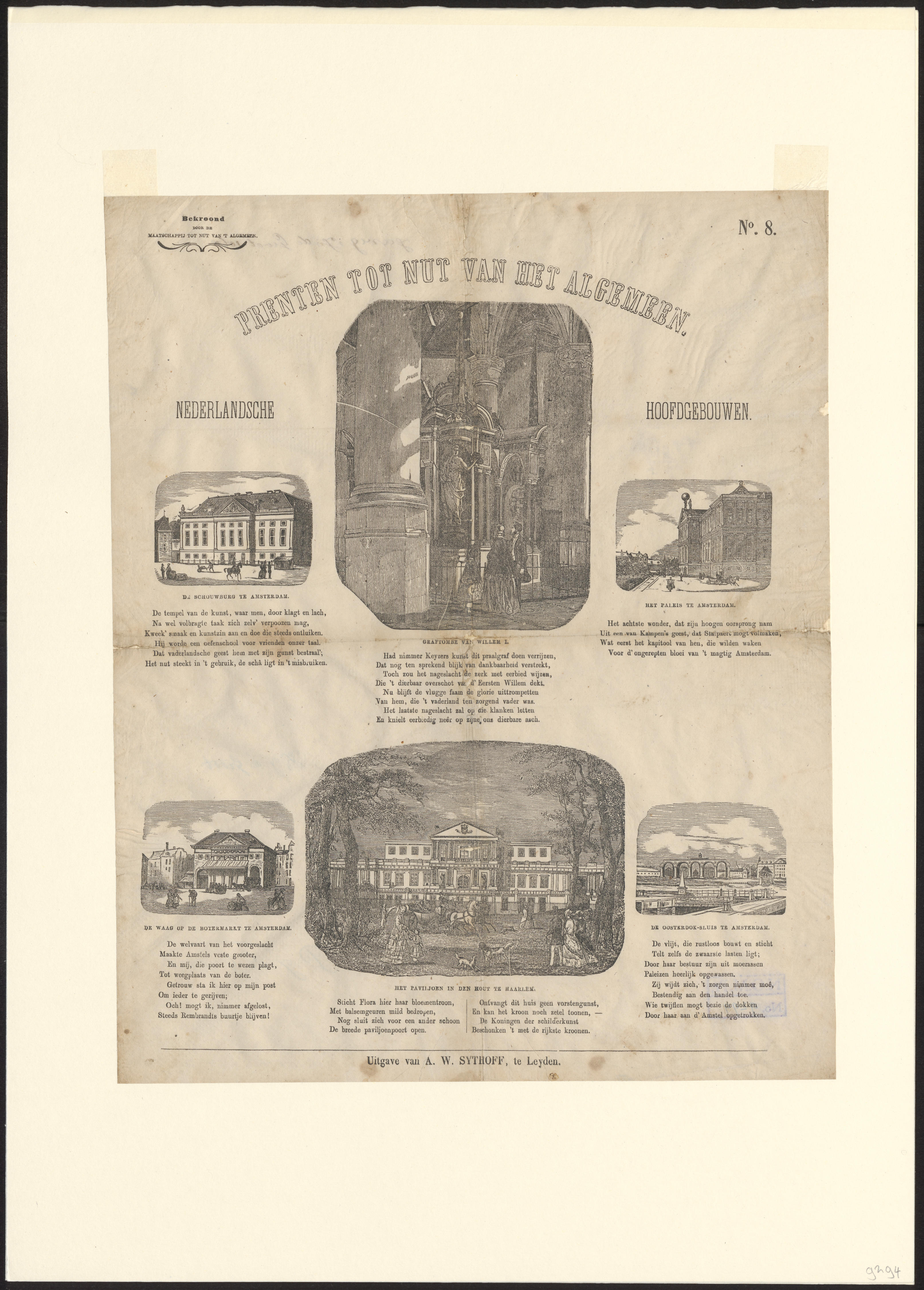 Prent met zes afbeeldingen van verschillende bekende gebouwen, gedrukt met afzonderlijke houtgravures. Onder iedere afbeelding staat een onderschrift. Linksboven staat de vermelding dat de prent is goedgekeurd door de Maatschappij tot Nut van 't Algemeen.