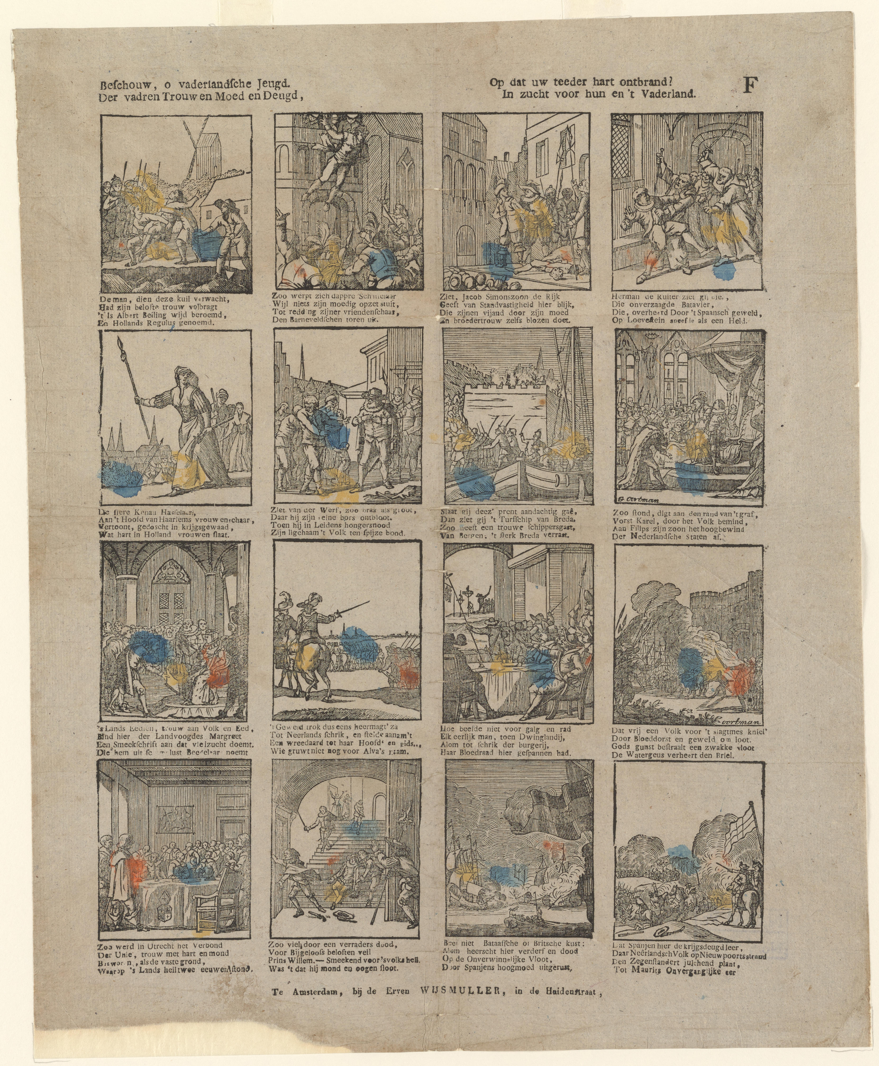 Prent met zestien taferelen uit de vaderlandse geschiedenis, waaronder de inname van Breda en Den Briel, de moord op Willem van Oranje en de slag bij Nieuwpoort. De prent is gedrukt met afzonderlijke houtsneden en ingekleurd met geel, blauw en rood. Onder iedere afbeelding staat een vierregelig onderschrift in boekdruk. De prent is op de ...