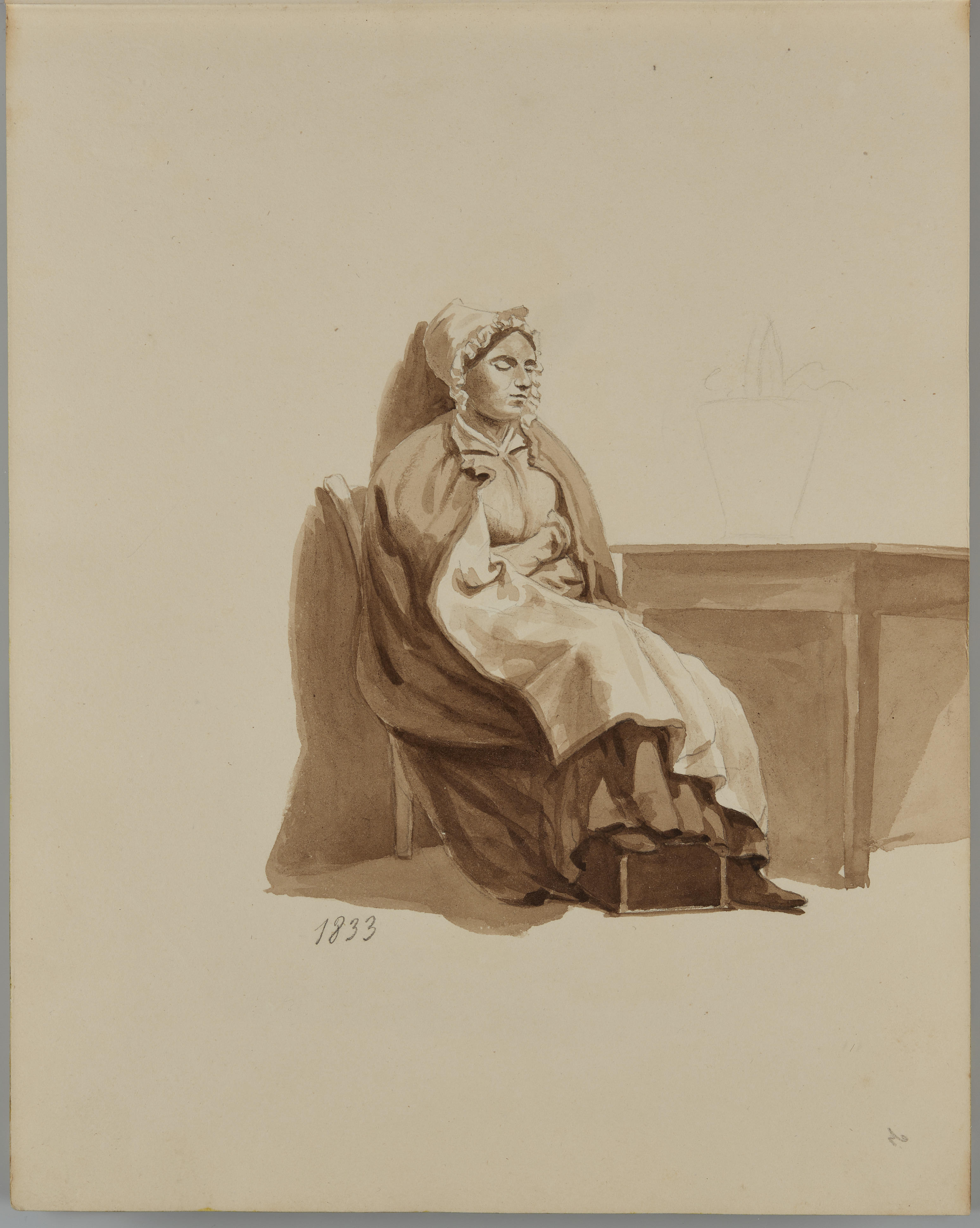Sepiatekening van zittende, slapende vrouw, afkomstig uit het schetsboek van J. Looyen (plaat 2).
