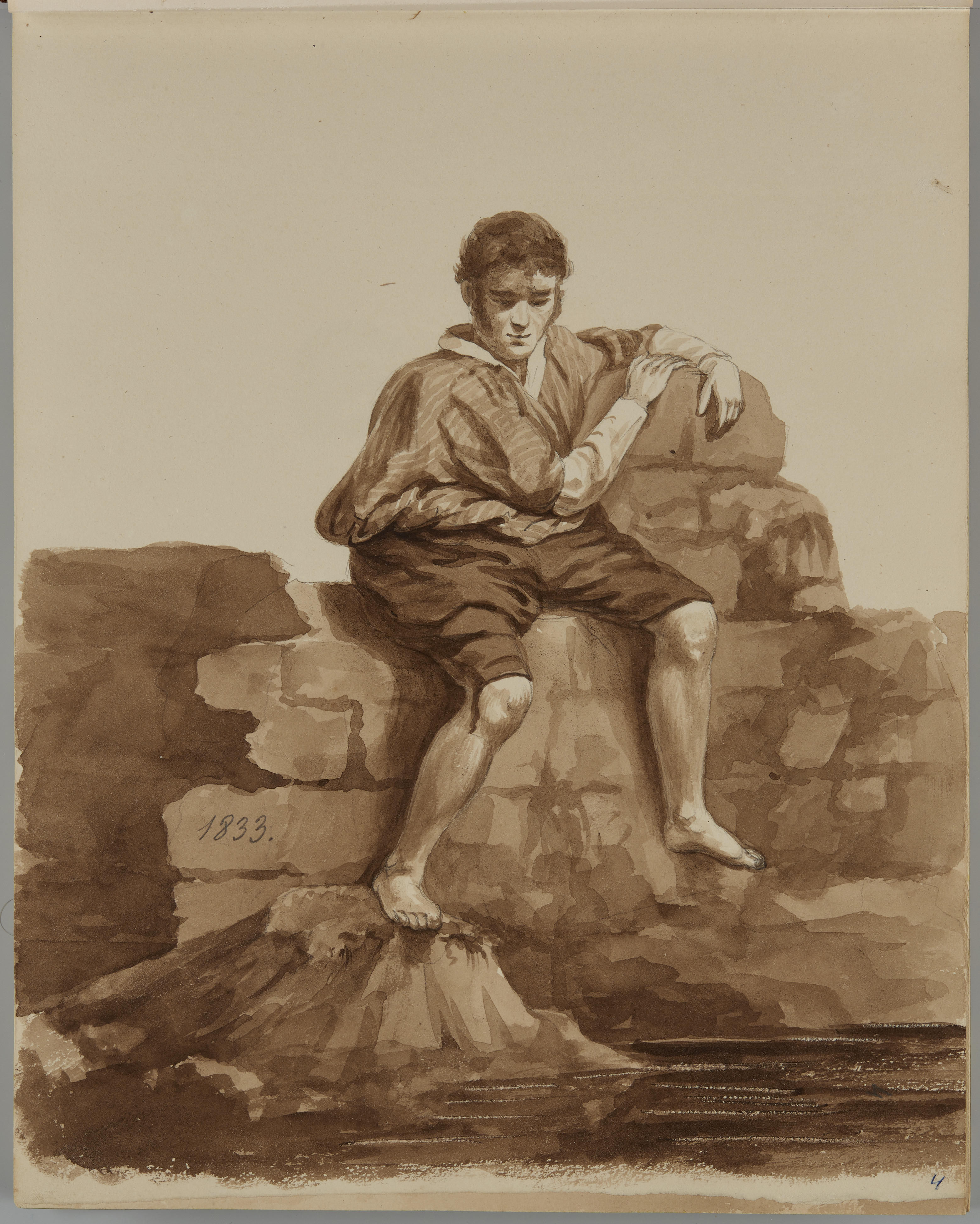 Sepiatekening van een man die op een muurtje zit, afkomstig uit het schetsboek van J. Looyen (plaat 4).