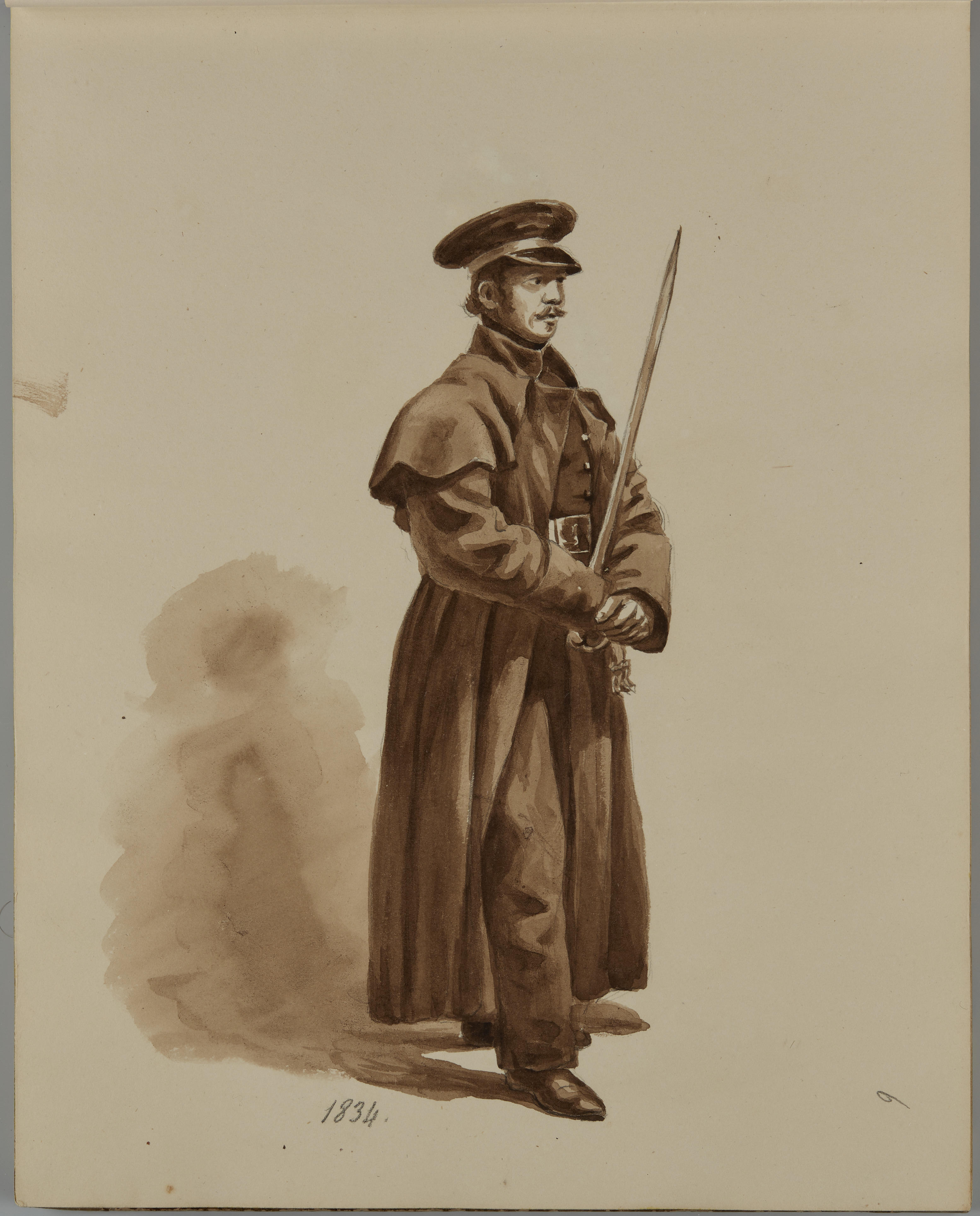 Sepiatekening van een militair met een sabel, afkomstig uit het schetsboek van J. Looyen (plaat 6).
