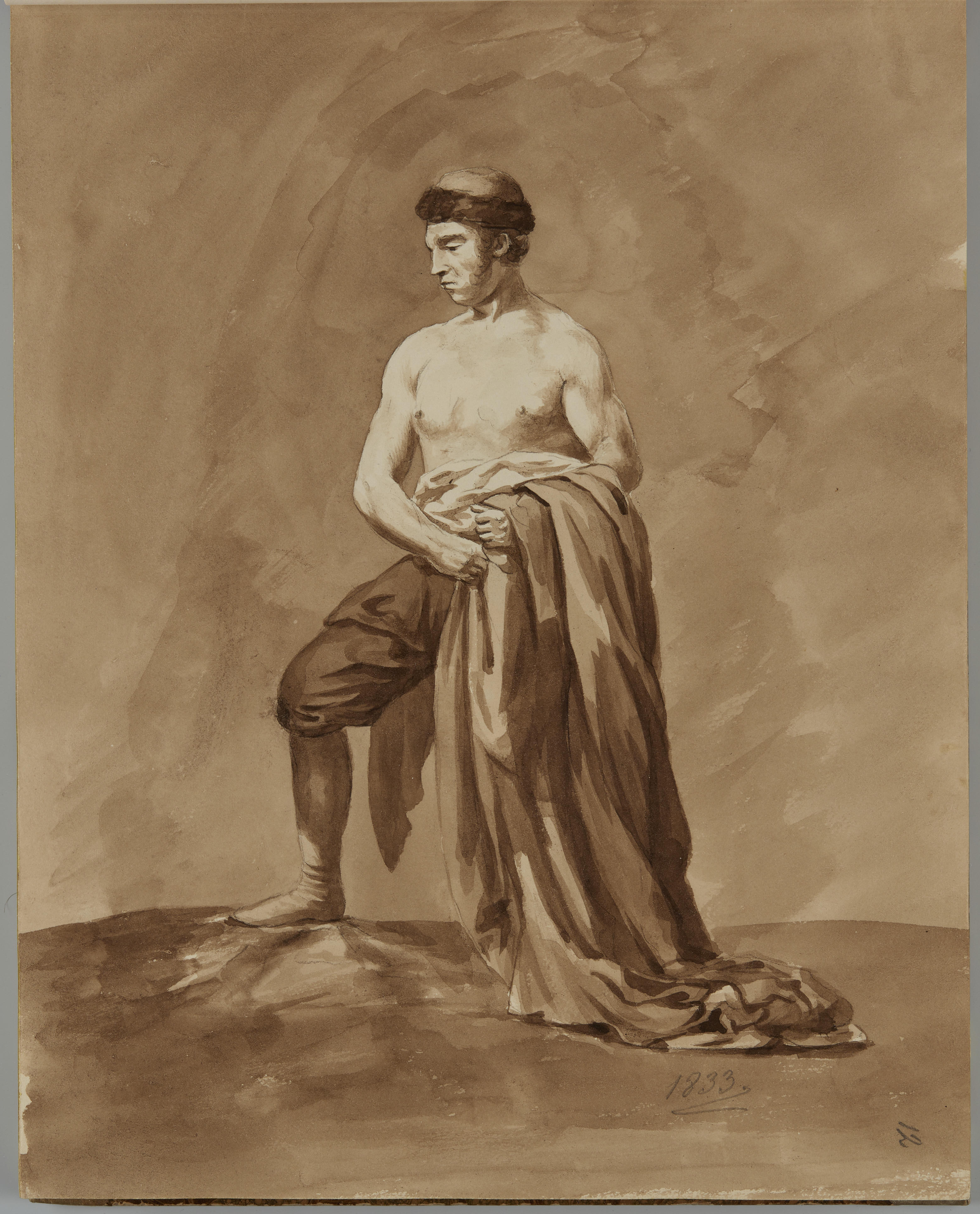 Sepiatekening van een man met een stuk zeil in zijn armen, afkomstig uit het schetsboek van J. Looyen (plaat 12).