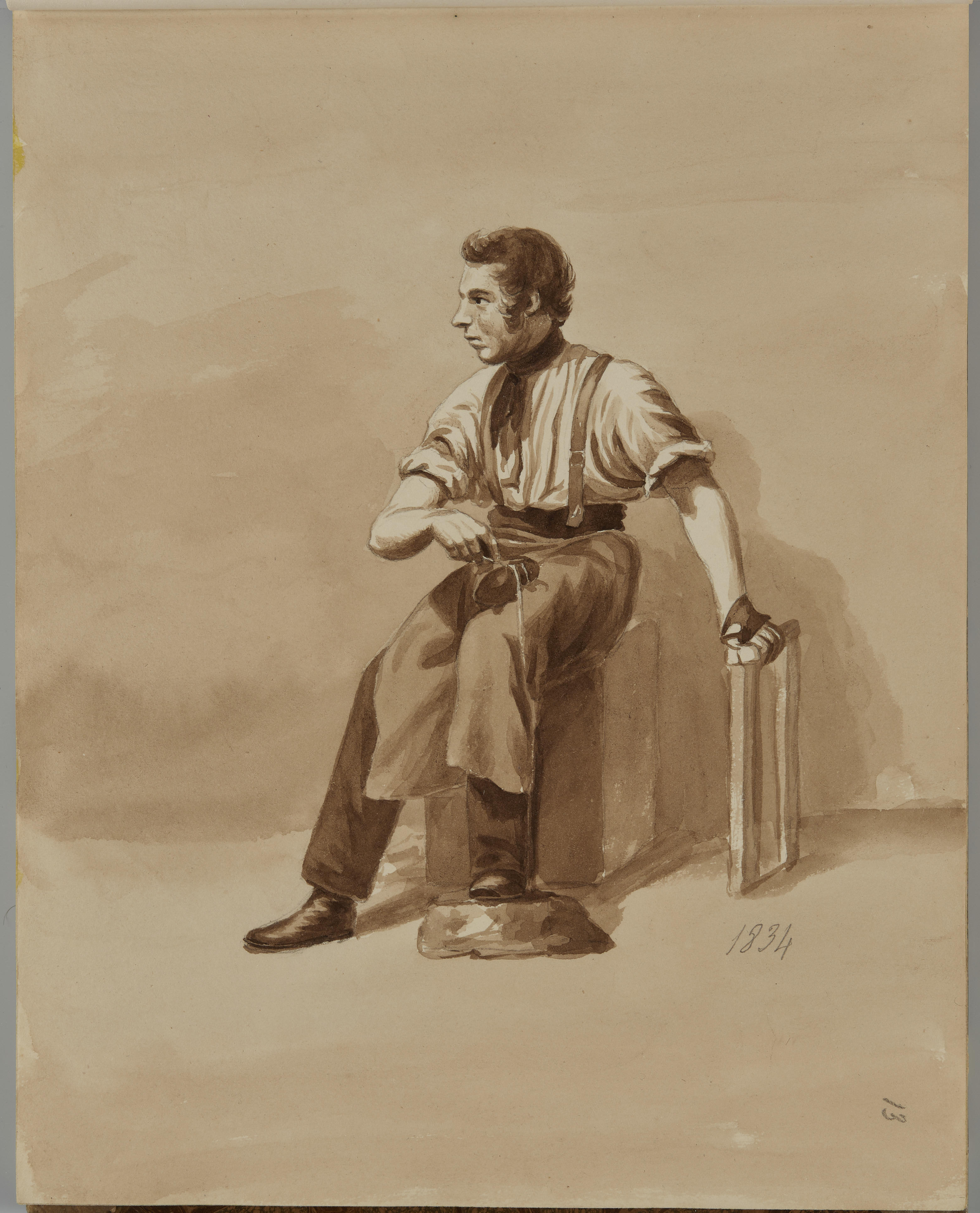 Sepiatekening van een schoenmaker, afkomstig uit het schetsboek van J. Looyen (plaat 13).